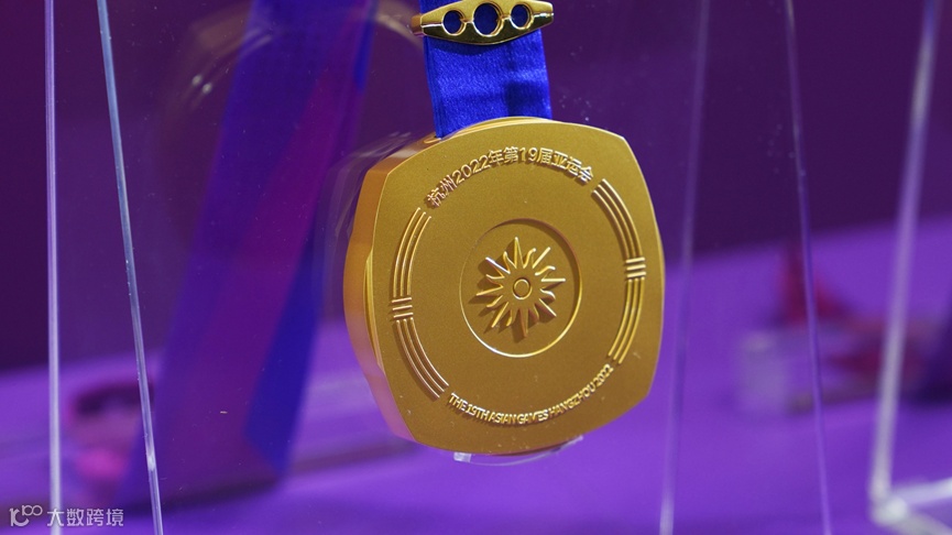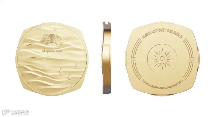 奖牌设计意象汇聚了杭州三大世界文化遗产——西湖、大运河、良渚古城遗址。设计首次采用“方圆相融”,且打破亚运会标志放在奖牌中心的常规版式,将标志置于开阔的画卷之上,体现开放包容的东方审美。