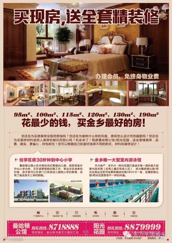 天兴地产,在天兴·阳光花园打造金乡唯一国标级大型室内游泳馆(设有儿童区和成人区),成为曼哈顿 ·公馆业主即可免费获赠游泳馆2年VIP卡一张,住曼哈顿公馆享受不一样的待遇。