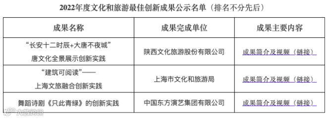 11月30日,文化和旅游部公布2022年度文化和旅游最佳创新成果,“长安十二时辰+大唐不夜城”唐文化全景展示创新实践项目作为陕西省唯一推荐项目,经过国家文化和旅游部组织审查、初评、答辩终审、实勘及评审委员会评审并报部批准,从全国七十余个优秀项目中脱颖而出,成功当选2022年度文化和旅游最佳创新成果。