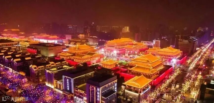 大唐不夜城位于陕西省西安市雁塔区的大雁塔脚下,北起大雁塔南广场,南至唐城墙遗址,东起慈恩东路,西至慈恩西路,街区南北长2100米,东西宽500米,总建筑面积65万平方米。