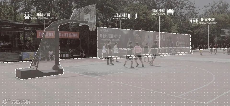 篮球场区域,本次设计则拒绝快餐式的功能更新,把激活运动需求和活力潜能作为出发点。