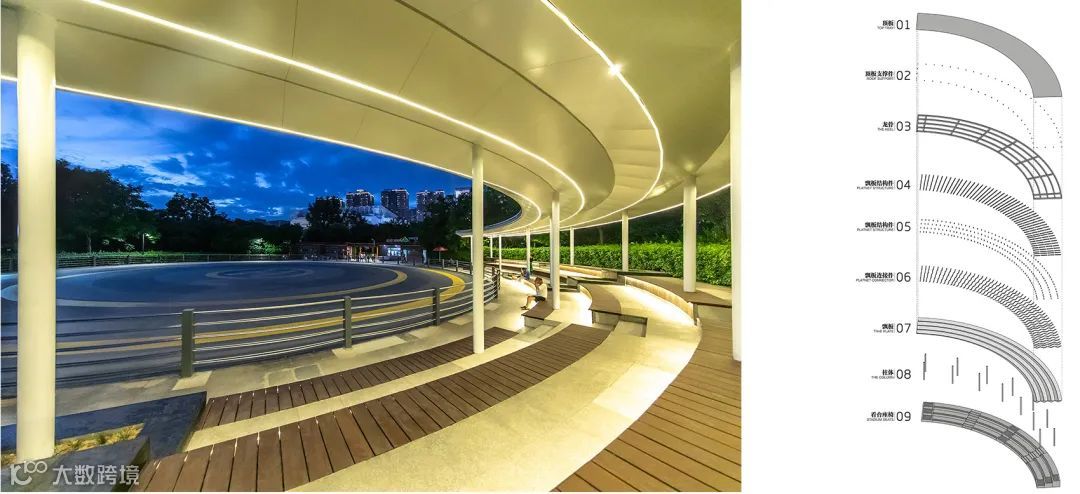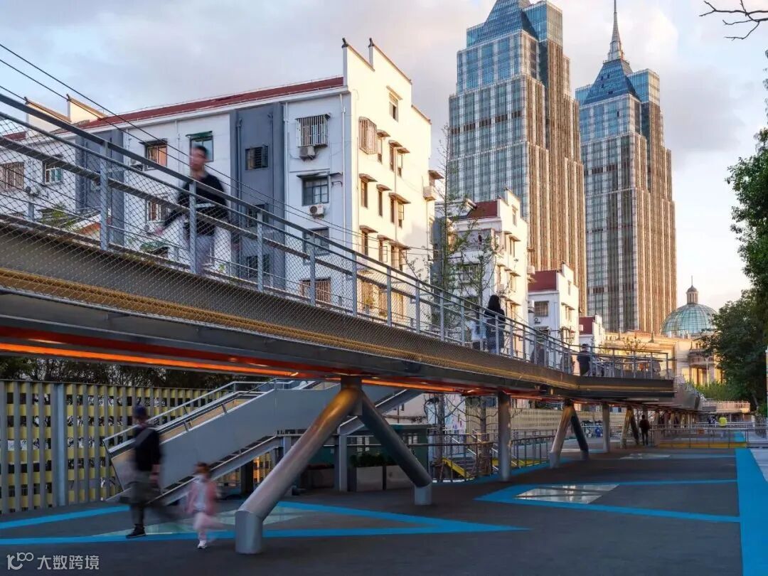 狭窄的场地通过立体的设计手段被赋予3倍的空间延展,成为附近住宅区、学校、商业办公等不同使用人群在不同时段下休闲活动的边界拓展。