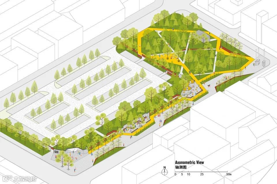对其进行改造,延续了周边生态的景观基底,呈现一个为老旧社区服务的口袋花园,重新激活社区的“边角料”空间,让土地重新呼吸,为场地注入新的活力。