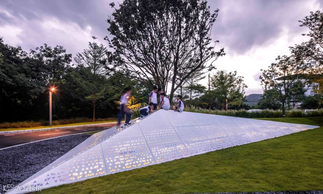 在直白的几何元素中,借用立体草坡和透光板,嵌入充满活力的社交体块,模拟出一个大自然的游戏场,让孩子们在有限空间无目的性漫游和奔跑,将荒废用地变为有趣且亲切的社交场所。