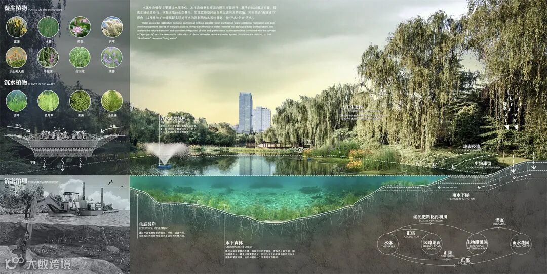 在对原始生态基底不做干扰的前提下,综合分析地表径流、生物滞留、生态水生植物体系后,增补湿生、挺水、沉水植物,通过技术手段降低水中氨氮含量,抑制藻类生长,试图打造水下森林,并将过多淤泥梳理后作为植物养料进行储备。