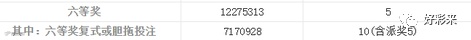 当期双色球六等奖开出1227万多注,其中717万多注为复式或胆拖投注,参与派奖活动,最后中奖金额为每注10元(含派奖5元)。