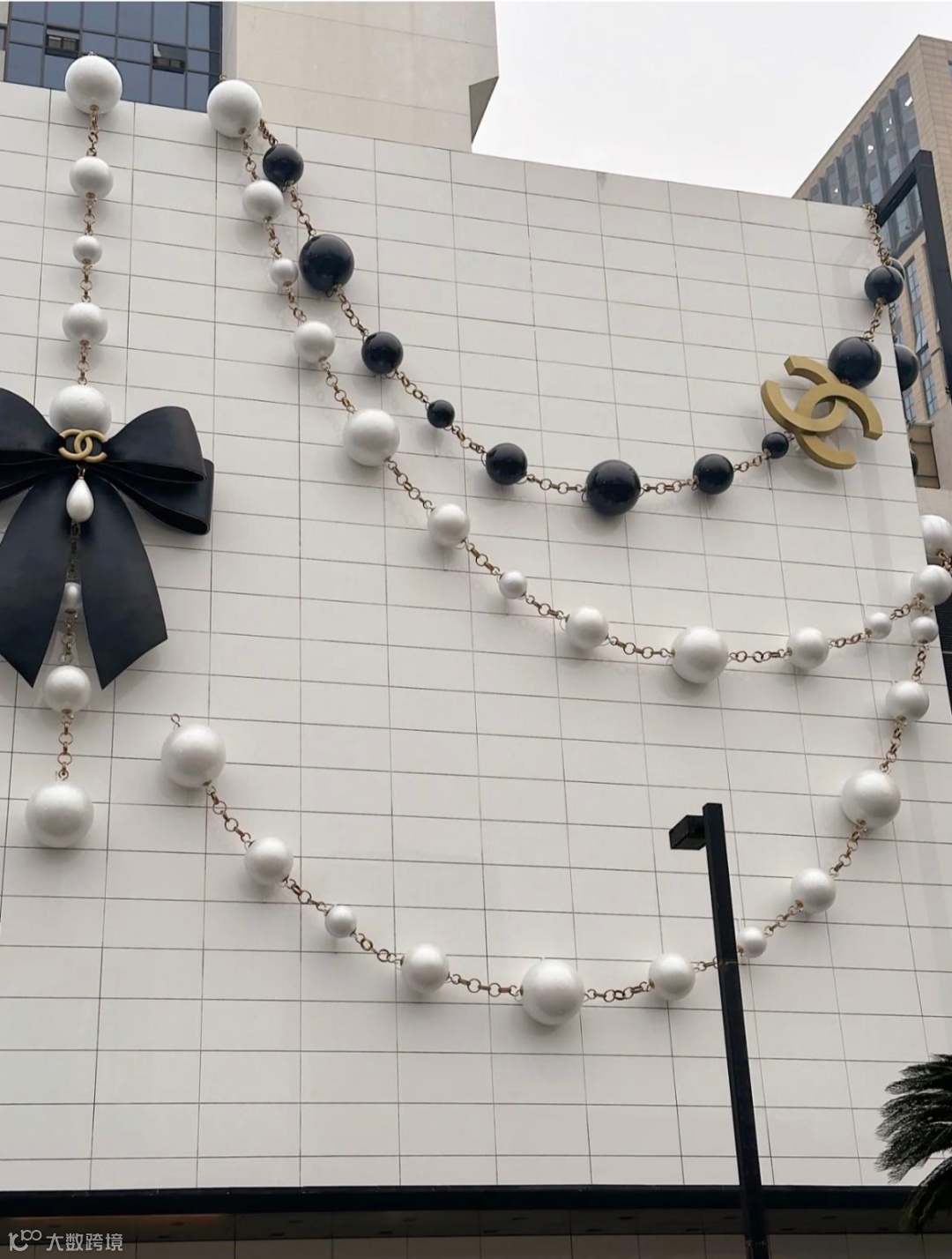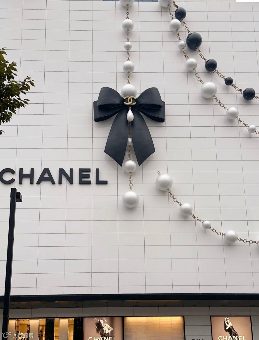 这是网友分享的在巴黎的香奈儿门头设计,同样也是珍珠和蝴蝶结元素,但由于是复古的墙面,显得更加高级,也符合香奈儿奢侈品的定位。