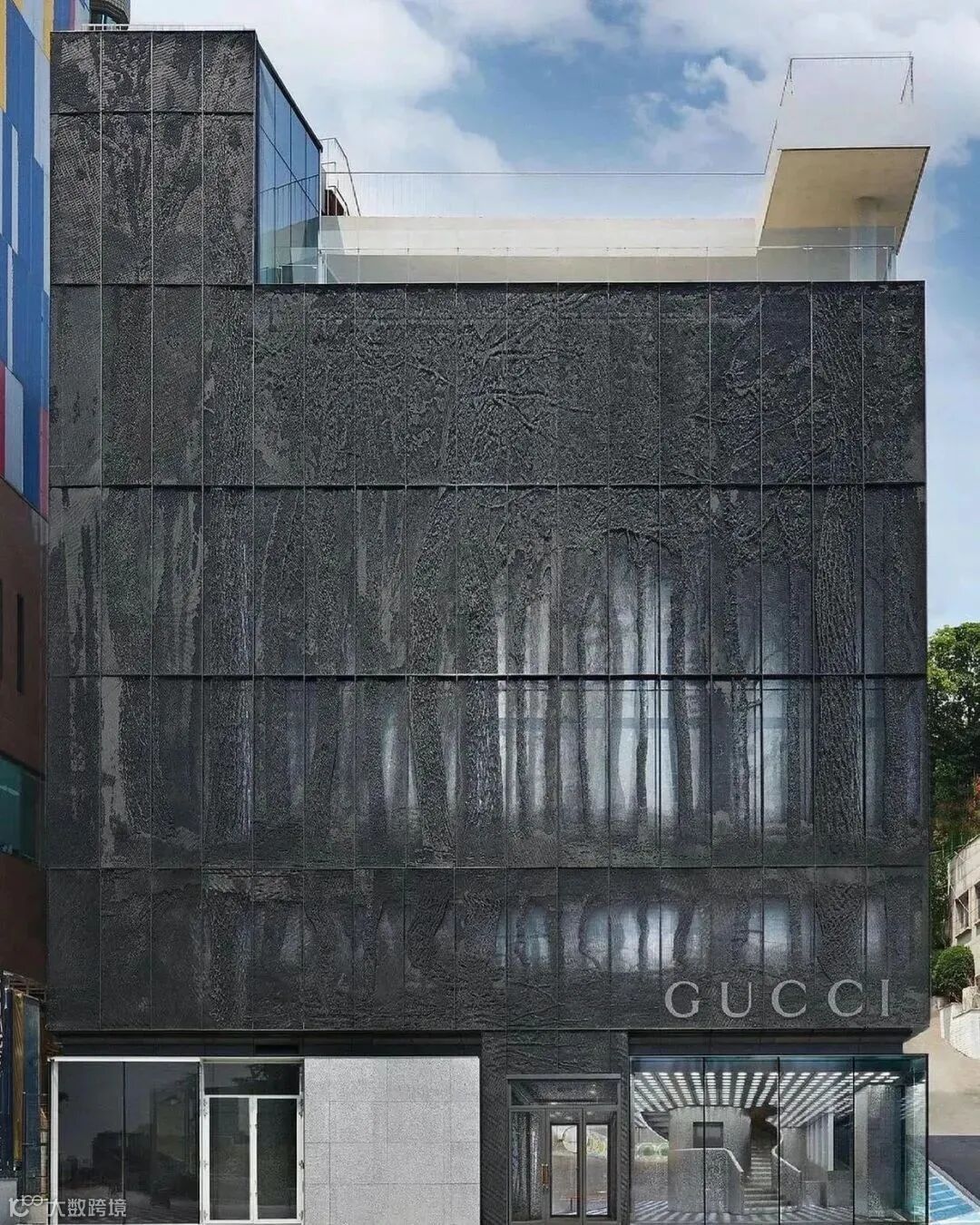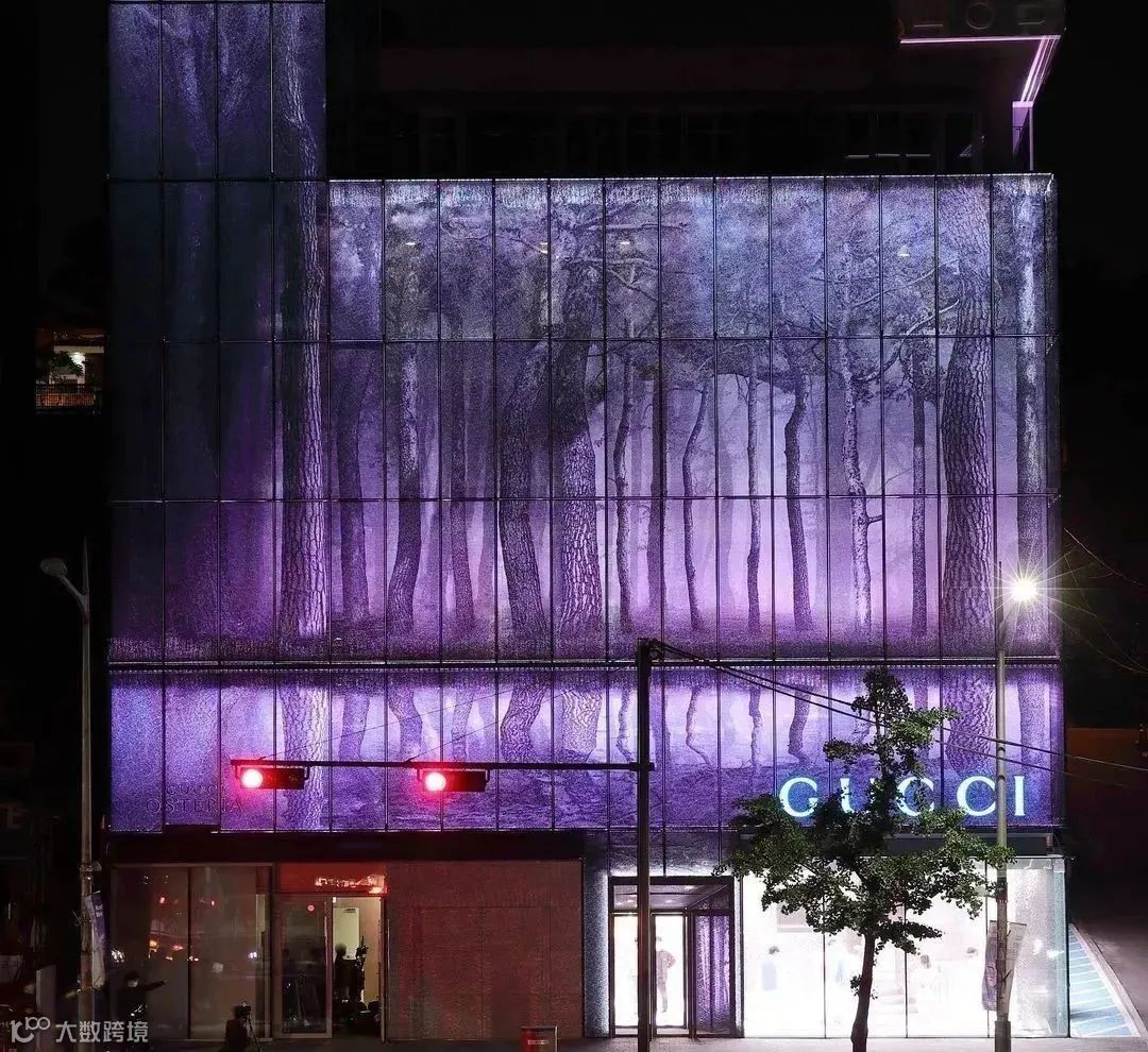 韩国梨泰院的GUCCI门店,采用了整面的灰色镂空设计,白天看是灰墙,晚上就是色彩变化的神奇树林。