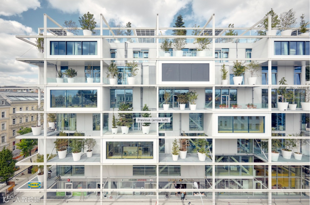 宜家维也纳西站店区别于常见的蓝盒子形象,外立面设计结合了宜家提货区标志性的高货架元素,并种有160棵植物,太有特色了。