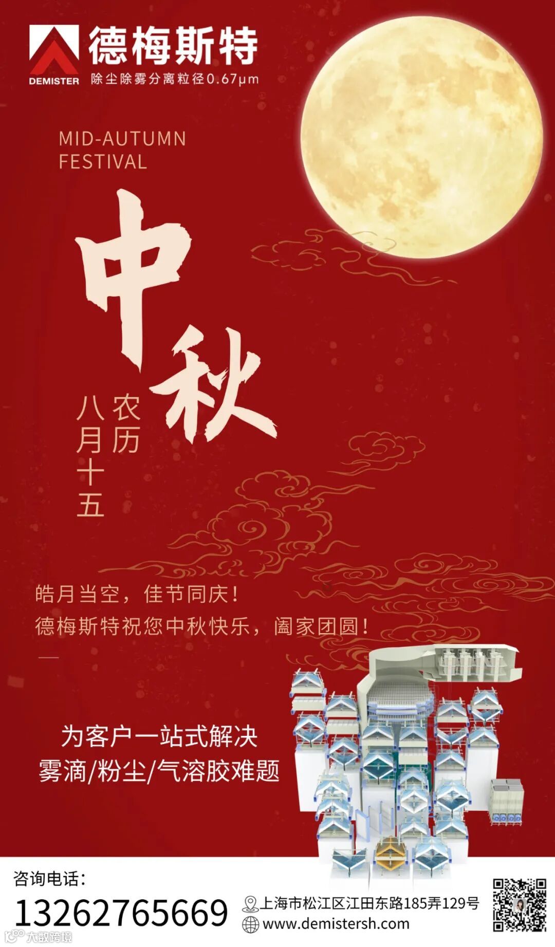 中秋佳节,德梅斯特向您致以诚挚祝福!月圆人团圆,我们深耕环保领域,以“为客户一站式解决雾滴、粉尘、气溶胶难题”为核心定位,依托冷凝除尘除雾器等核心产品,为客户提供精准、高效的分离技术综合解决方案。我们的愿景是成为分离技术领域的全球领导品牌,践行“为客户创造价值、为用户解决烦恼、为团队实现梦想,为绿色中国助力”的使命。