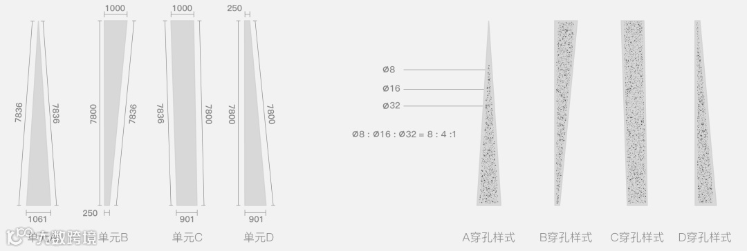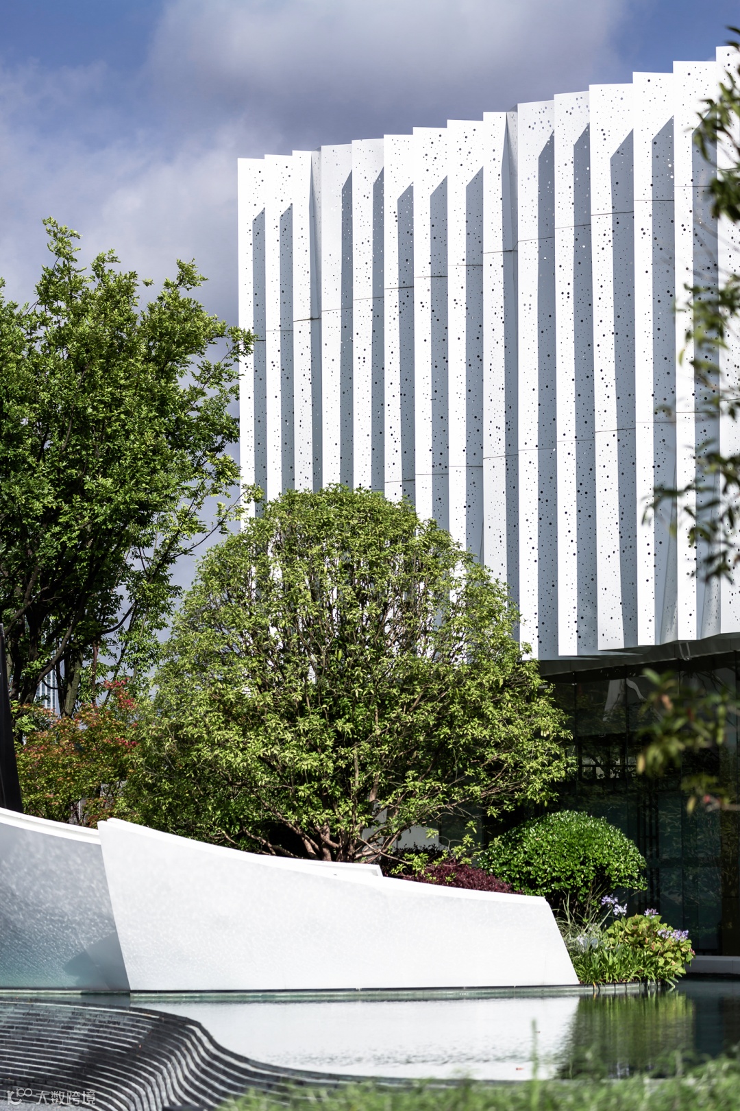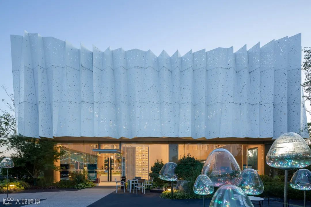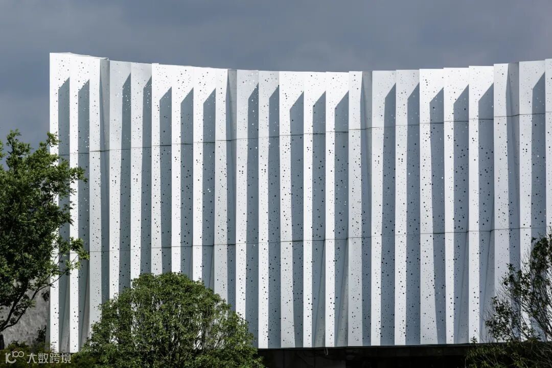 纯洁且极具未来感的建筑体态,截面则蕴含着不规整的排列之美,如同连续起伏不断的崇山峻岭,消隐于苍茫的丛林之中。