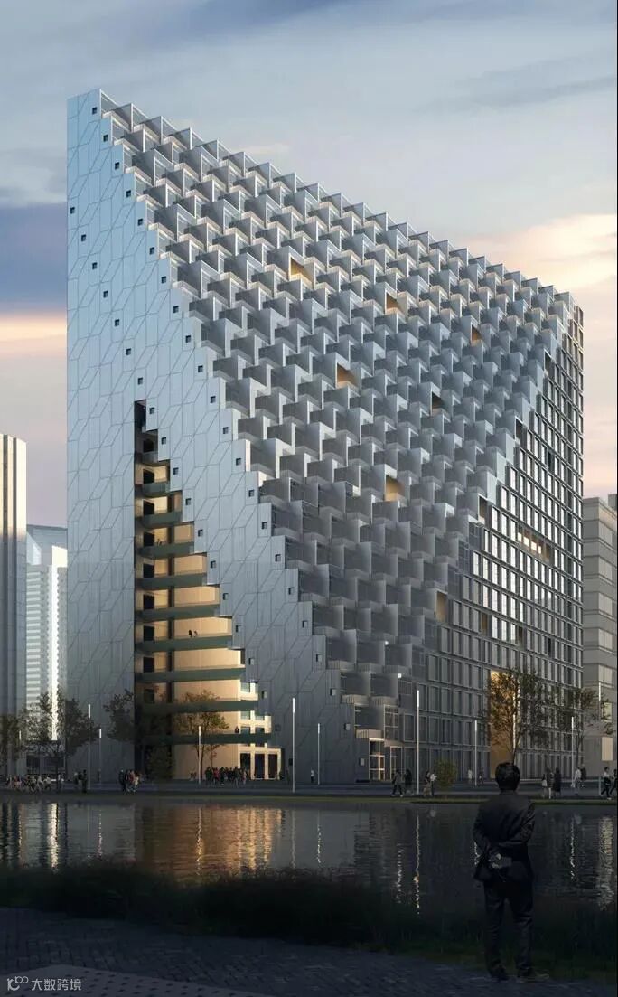 杭州未来新湖中心坐落在杭州未来科技城新科技中央商务区的核心,建筑包含两栋大楼,西侧是一栋106米高内含88米花园中庭的大楼,东侧则是144米高的塔楼。建筑形态如同指向云端的一座山峰,OMA 通过对建筑基本轮廓进行大胆的斜切处理,形成梯田状 loft 单元,也似玻璃构成的金字塔,因此得名“光棱”。