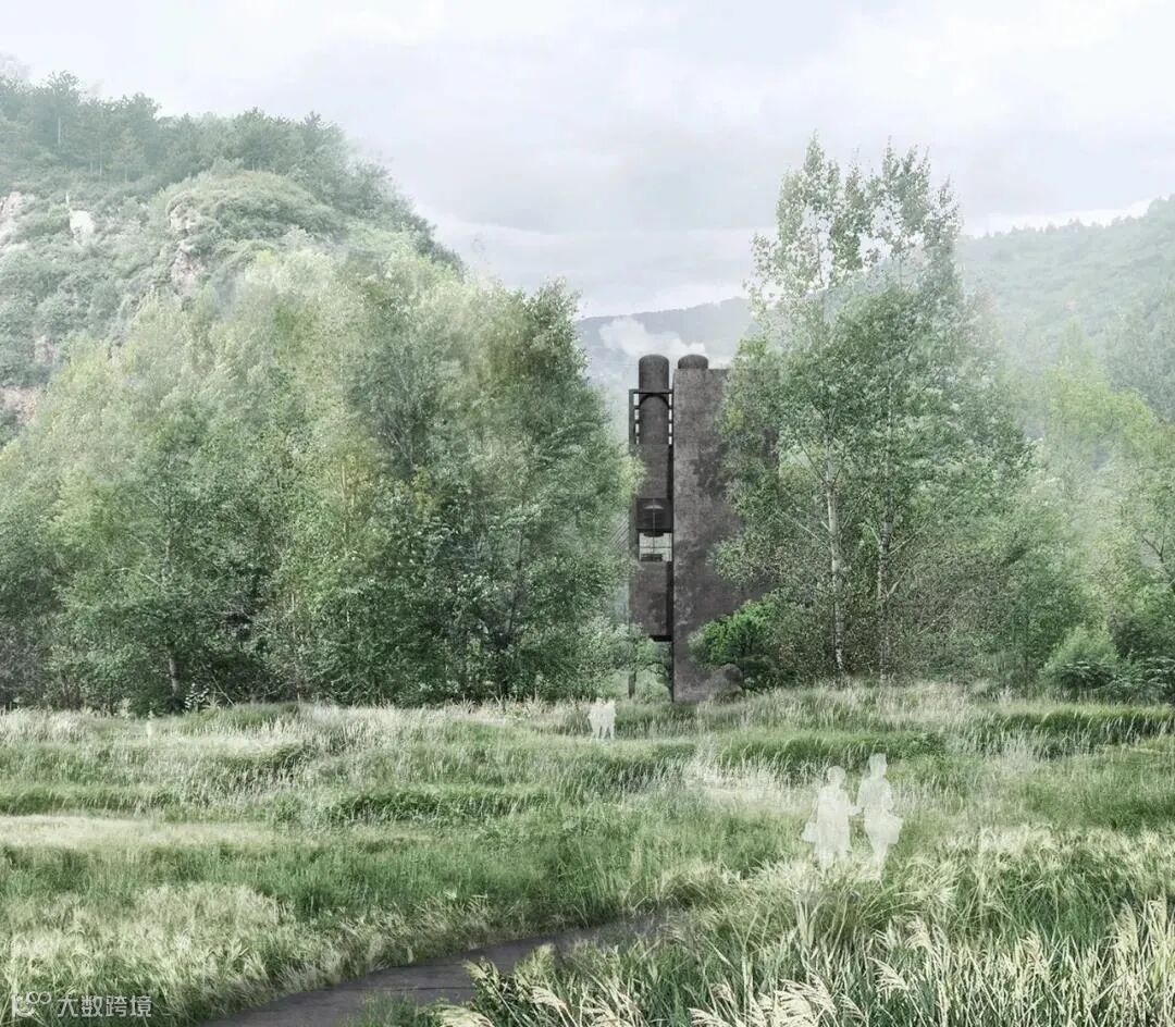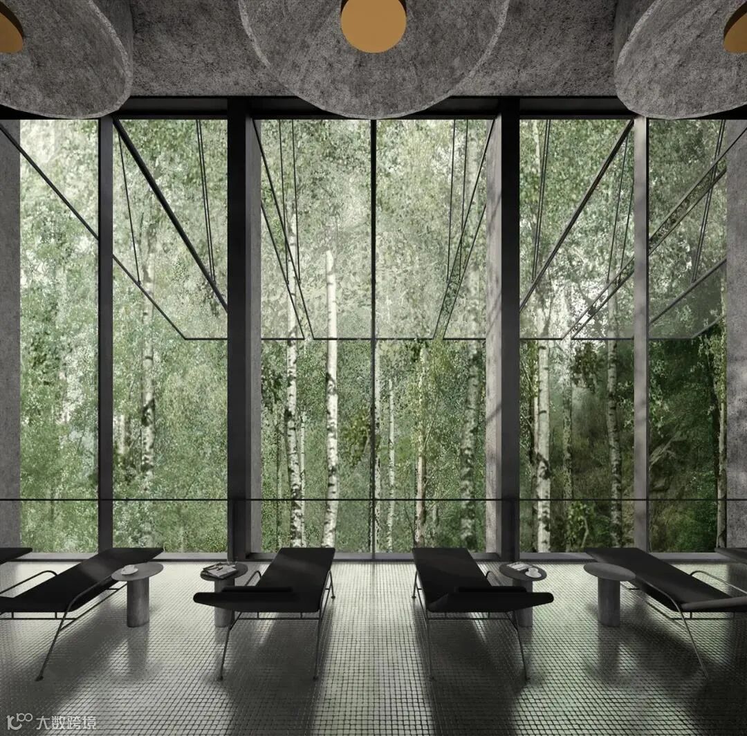 这个建筑是一个温泉的机器,被轻轻地放在场地的斜坡上。为了尽量减少建筑介入对原始地貌的干扰,建筑被整体架起,通过立柱将主要体量与土地相连。建筑师在垂直方向上进行体量分布设置,一是为了缩小建筑的基底面积,二是试图利用空间在不同高度和树木、崖壁、远山景观的各种关系,去塑造在其内部相对应的独特感受。