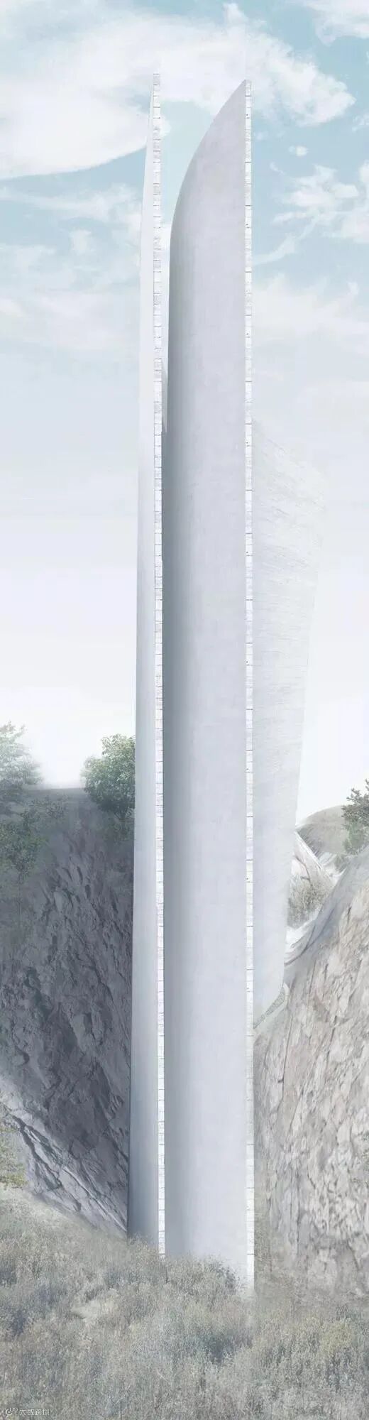 这座教堂坐落于中国山东省日照白鹭湾的山谷中,由45米高的单层混凝土墙组成,只有1.35米宽,纤薄柔软,光线从顶部开口照进深处。