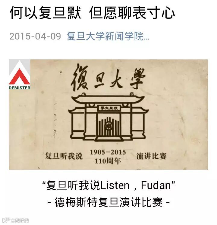 由复旦大学举办的复旦大学110周年校庆、复旦听我说Lister,Fudan-德梅斯特复旦演讲比赛决赛,于2015年5月17日晚7点在复旦大学主校区光华楼二楼报告厅举行。德梅斯特公司总经理程子剑等人共同出席本次活动。
