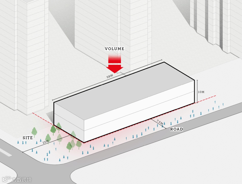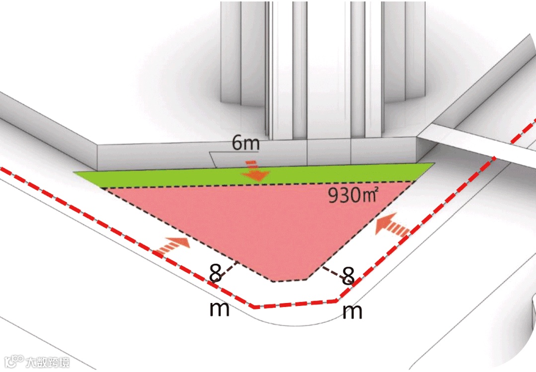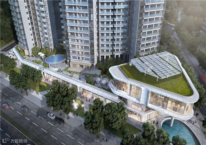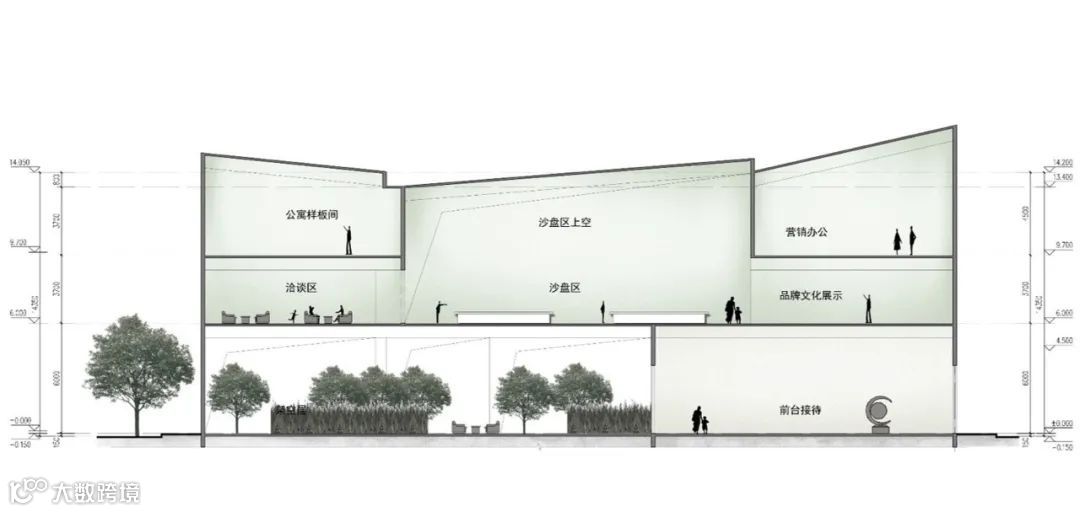 售楼处和一层商铺结合整体设计,延续商业界面的同时也赋予建筑瞭望台的意义。