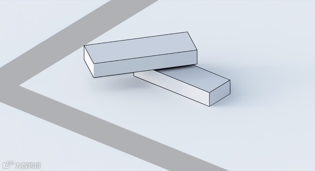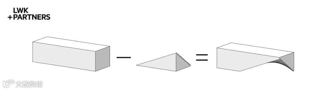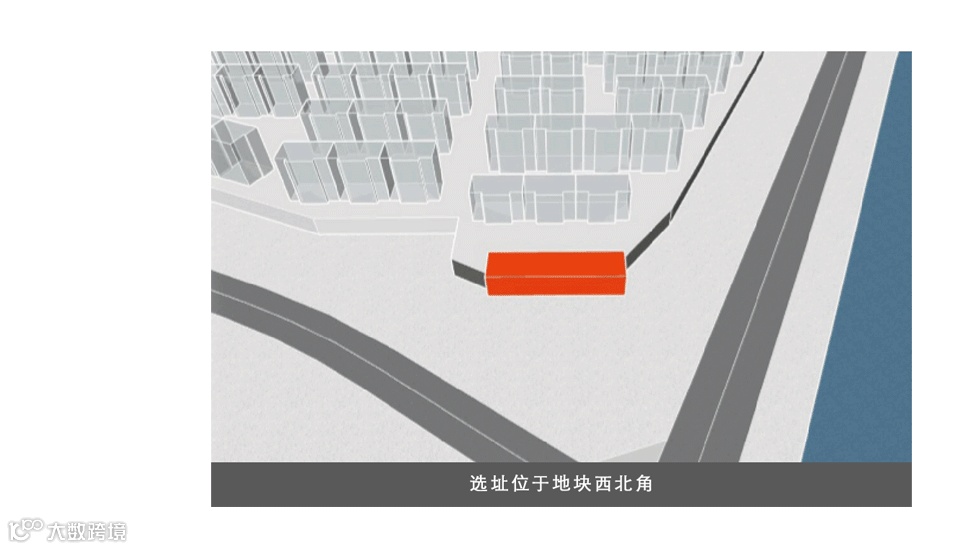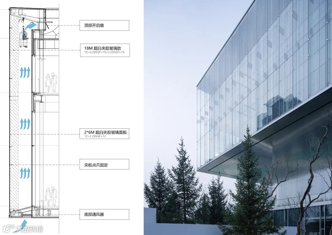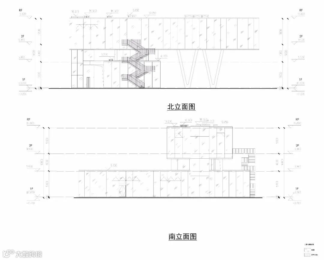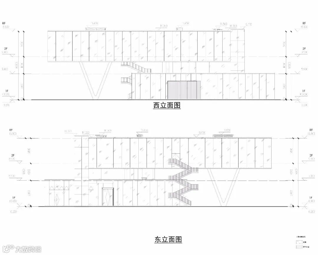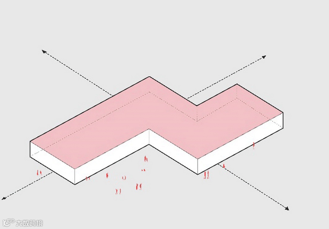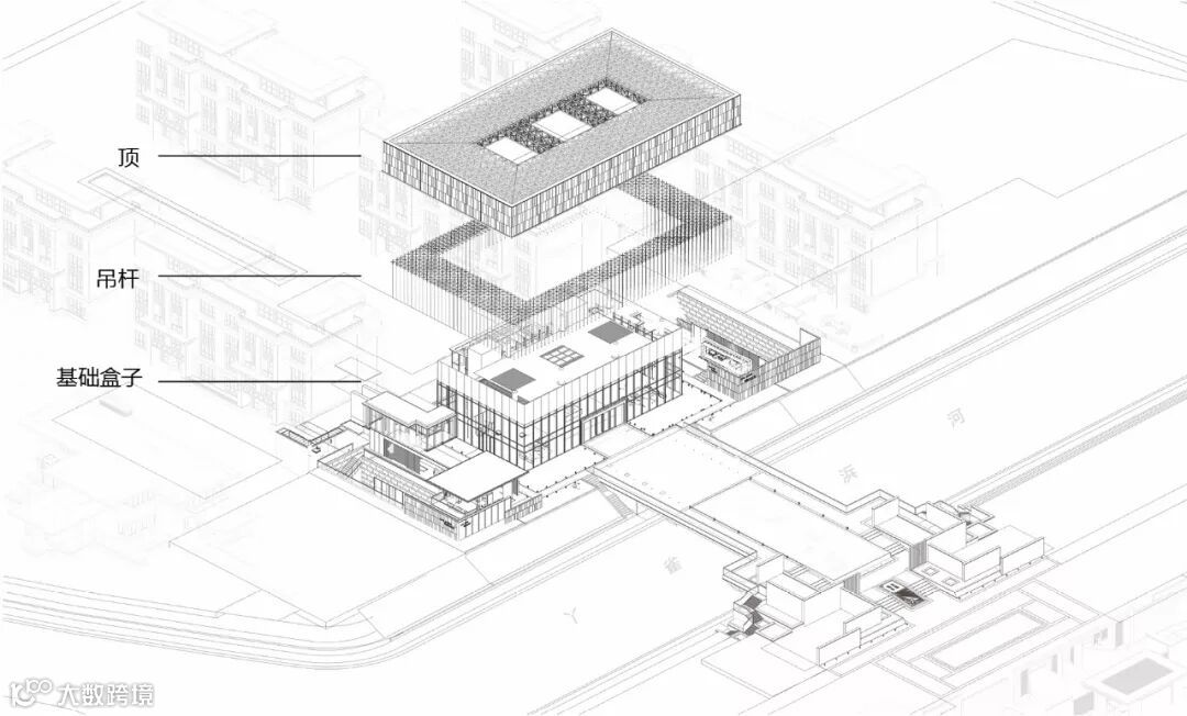 建筑基座上悬浮着三个纵向盒子,二层进行了局部悬挑,两个对称V字形支撑柱结合悬挑部分形成了建筑灰空间。