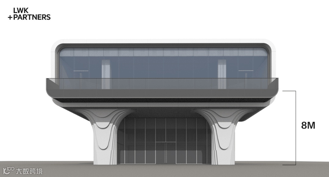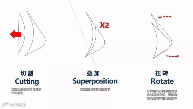 为了强调瞭望台这一概念,通过反梁等设计手段,视觉上大大的增加了顶层的体量,切割第二层,形成两侧露台。流线型立柱撑起的第三层成为建筑主体,强化了视觉感受。