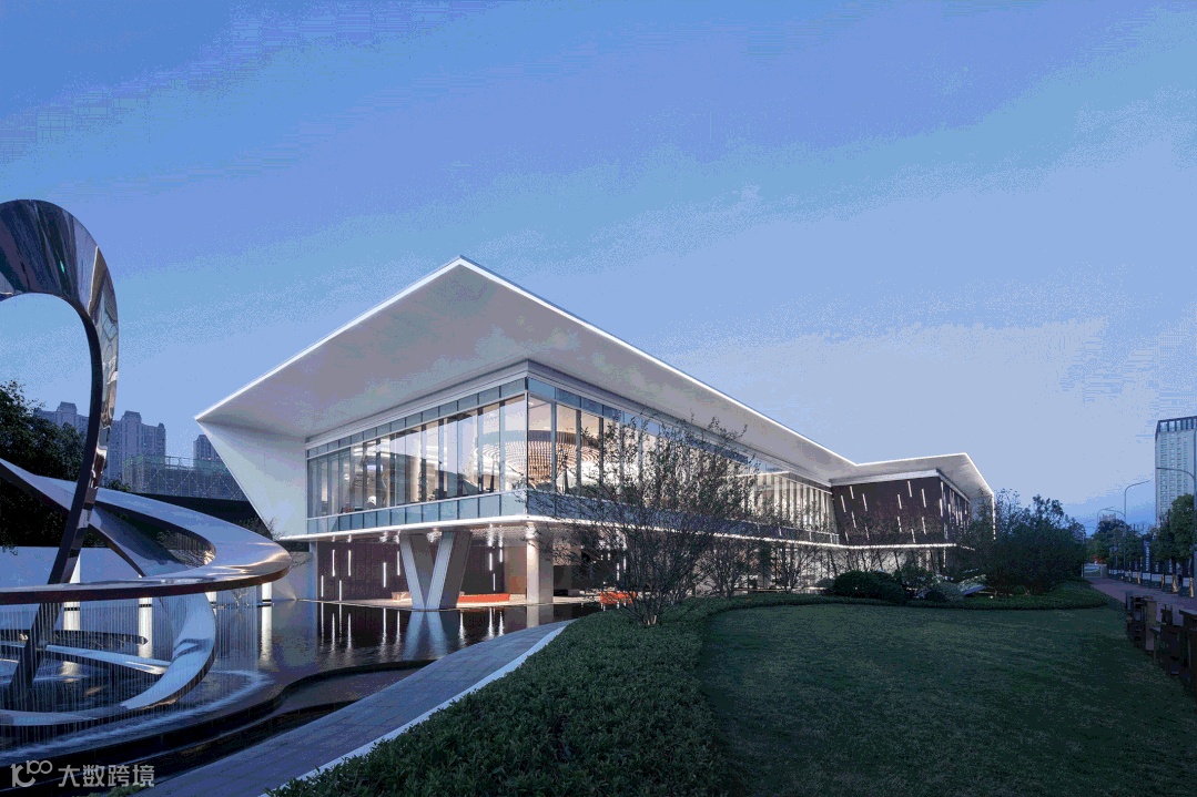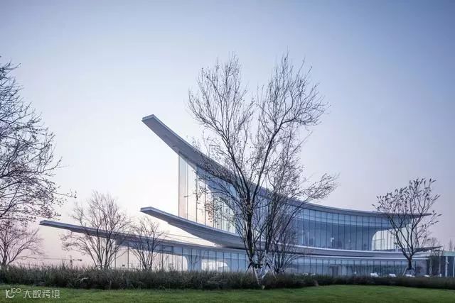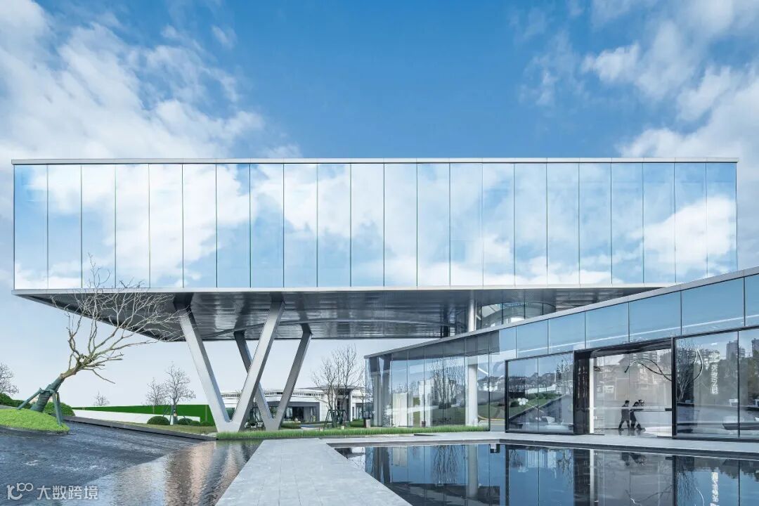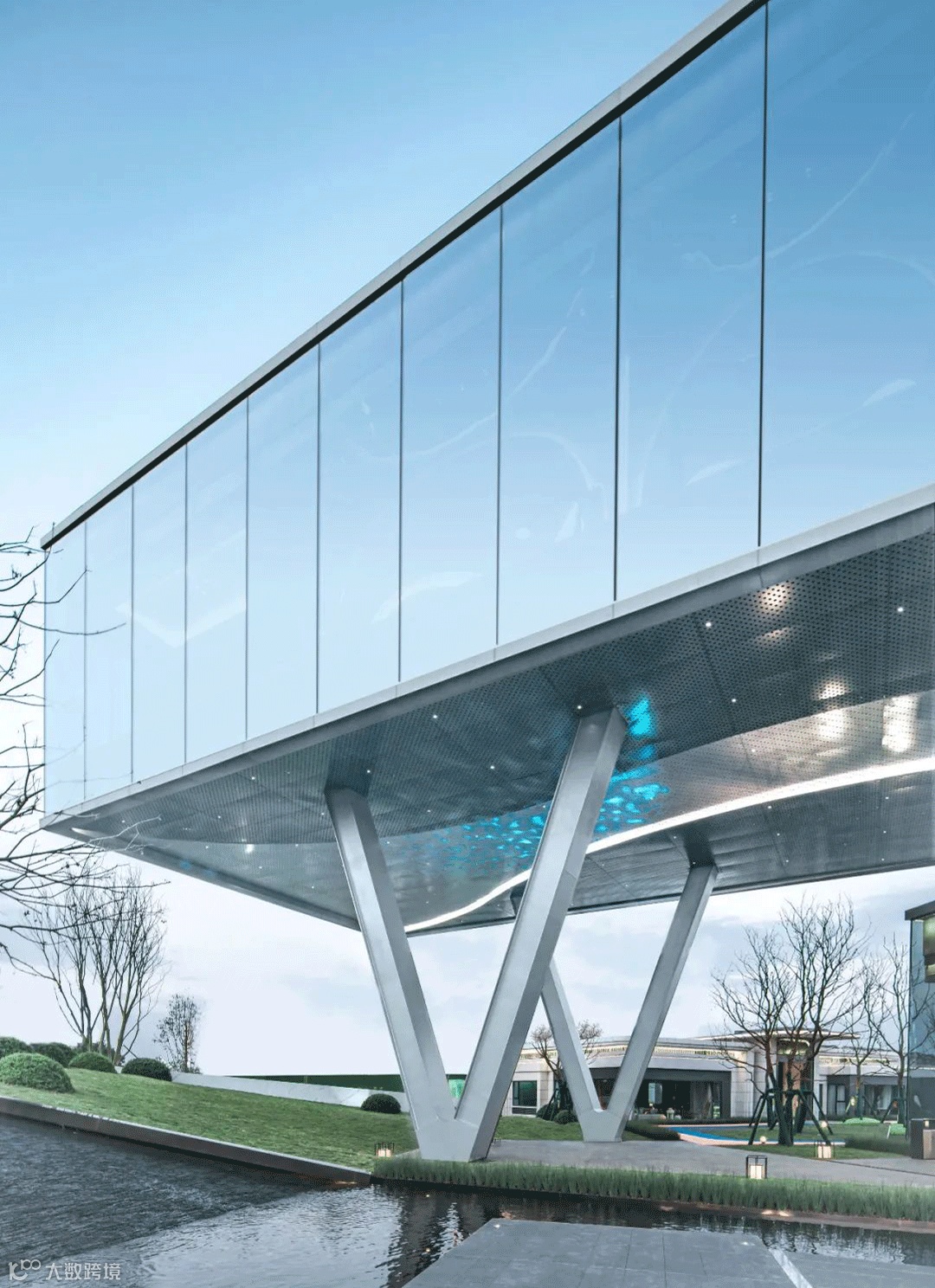 浙江保利银杏小镇售楼处,通过“悬挑”、“悬浮”、“极简”的设计理念,使用空间桁架梁式的钢结构形式,利用超细斜撑结构促成超级悬挑结构,创造售楼处主体建筑飘逸而通透的建筑形式。
