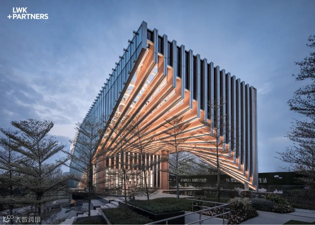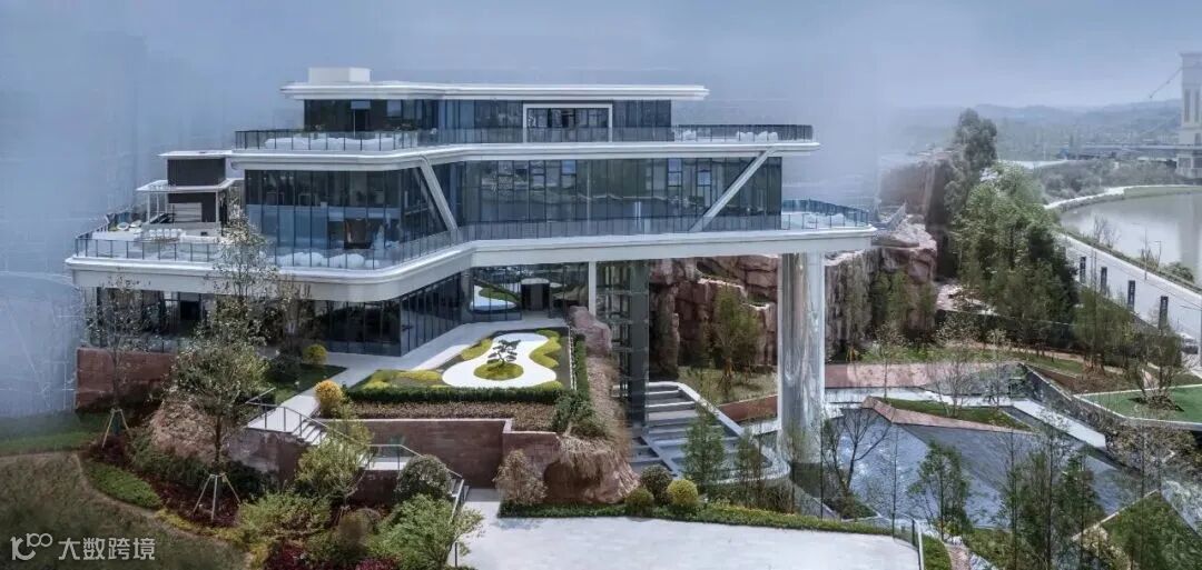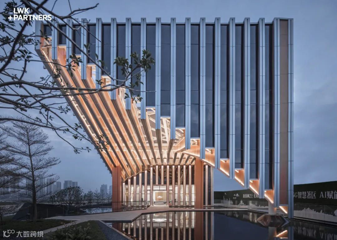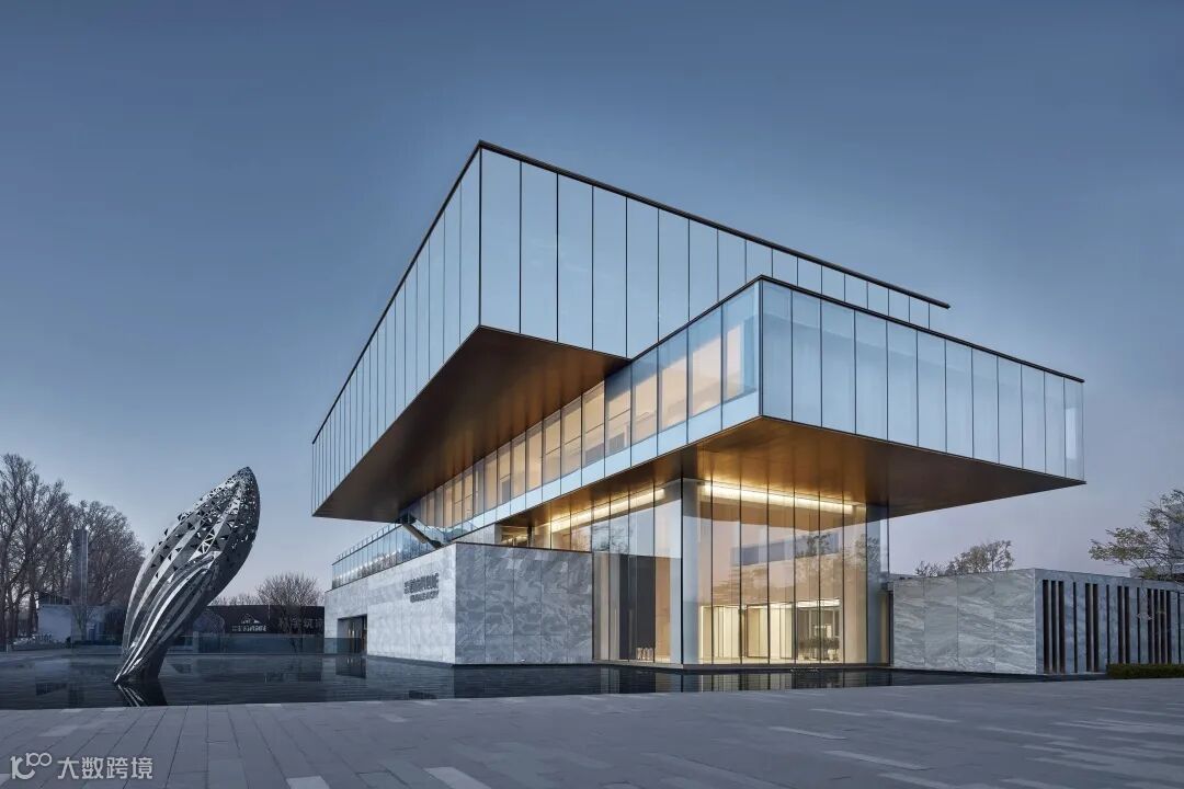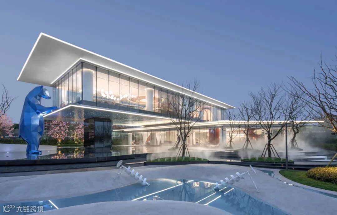 重庆佳兆业·晓岸云起展示中心造型如同一个被淘气孩童旋转错位的两块堆叠的“矩形透明盒体”,而盒体的一端立着一个大熊,这样的悬挑趣味十足,很难不被吸引。