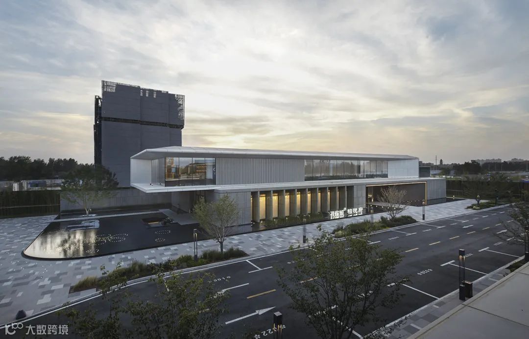 固安孔雀城柏悦府—示范区接待中心建筑的两层体量通过叠合错动,单向悬挑形成了富有视觉张力的建筑形体。