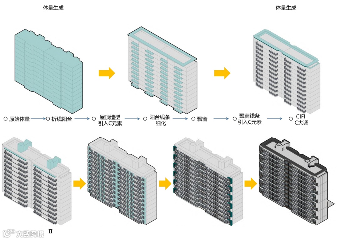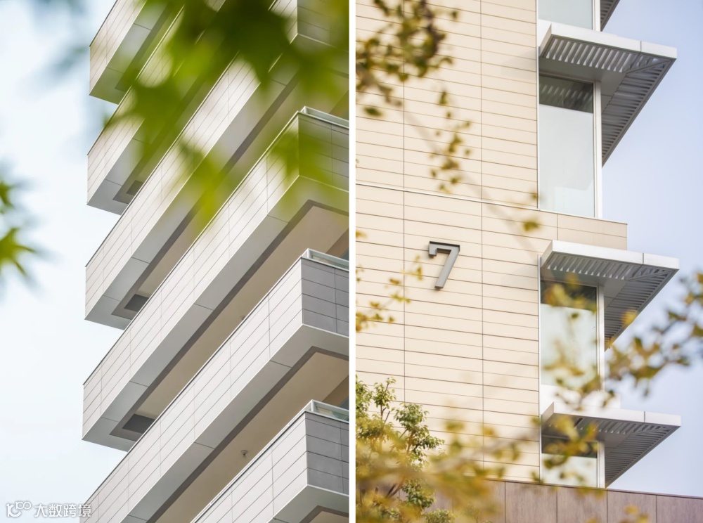 建筑的细节,充满设计巧思,采用C型屋顶,呼应主题,描绘出项目可识别的C大调标志。阳台折线强调C型元素,通过粗细结合的线条形成韵律。