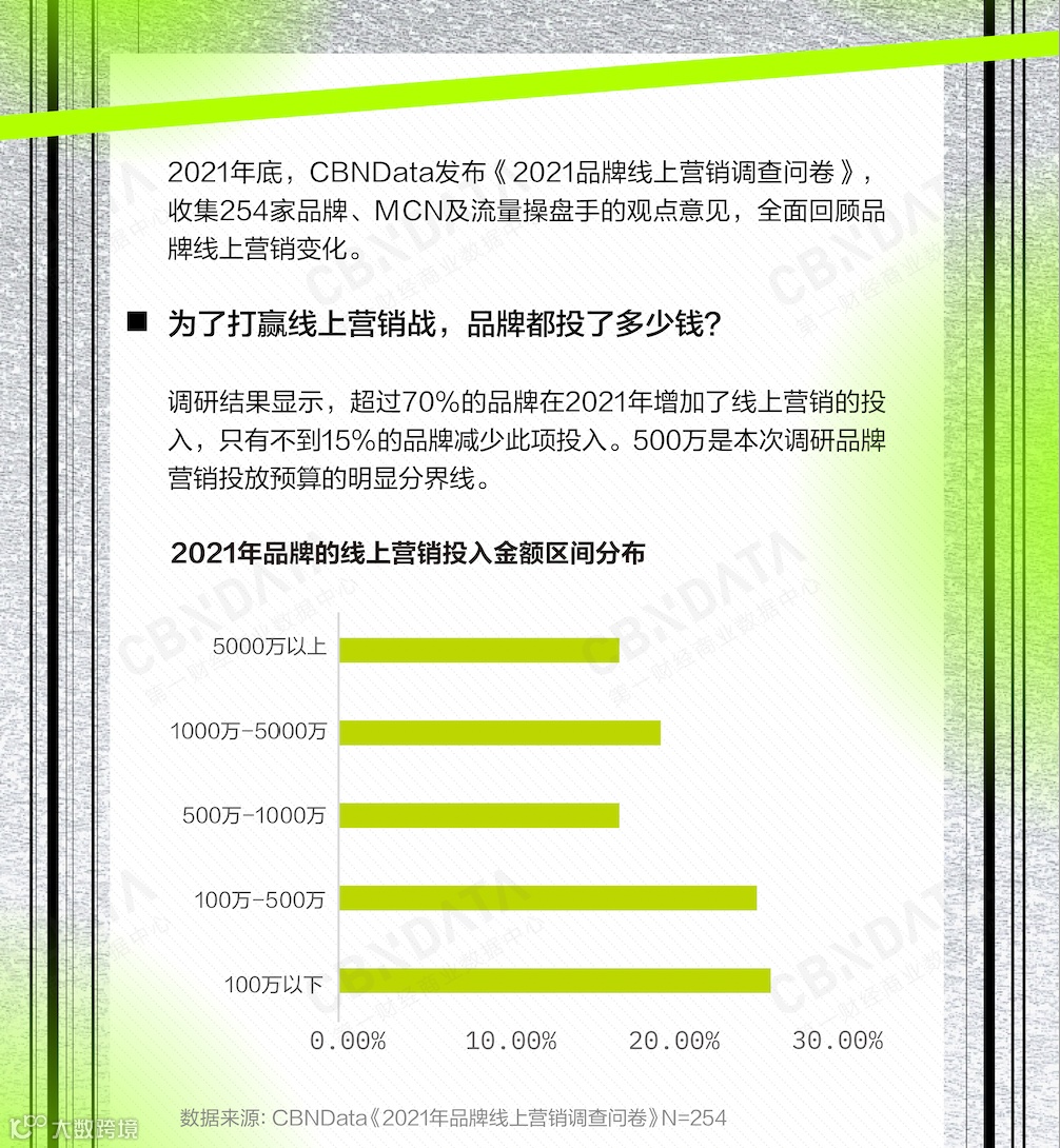 近两年,大量品牌开始加速数字化转型,线上流量竞争愈发激烈。根据 CBNData 的调研,超过 70%的品牌在 2021 年增加了线上营销的投入,只有不到 15%的品牌减少此项投入。具体来看,「500 万」成为一个比较明显的分界线,调研中,