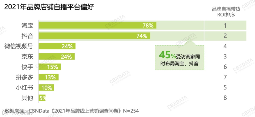 在对线上营销模式的进一步研究中,CBNData 根据问卷调研及品牌走访发现,直播营销依然最受品牌关注。其中,超过 7 成品牌在淘宝、抖音开展自播,近一半受访商家同时布局淘宝、抖音。微信视频号及京东的品牌自播渗透率相当,分别有逾两成品牌在以上两家平台展开自播。