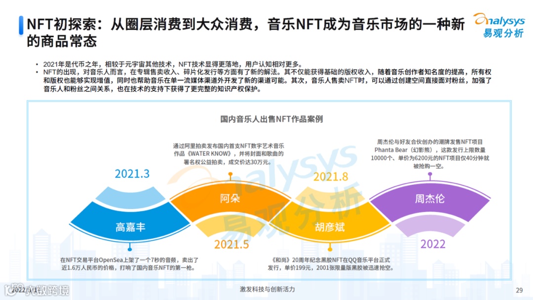 易观分析《2022 年中国在线音乐市场年度综合分析》指出,音乐产业链上下游企业正在快速探索音乐元宇宙,催生出多元音娱形态。音乐 NFT 从圈层消费过渡到大众消费领域,已成为音乐市场新的商品常态。