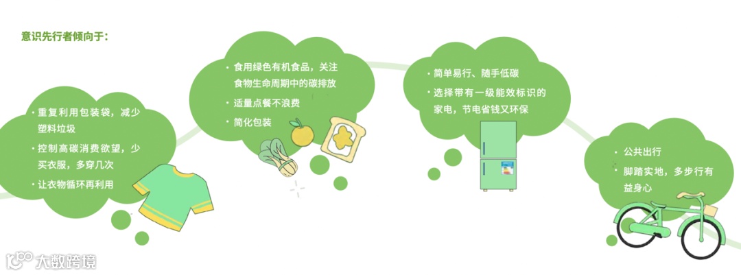 消费者对于低碳消费建立了积极的印象。在行为选择方面,主要集中在「绿色出行」(65.7%)、「环保材料」(54.26%)、「循环再生」(52.75%)、「节水节电」(44.26%)、「垃圾分类」(43.96%)等行动上。因而,开展低碳消费和生活方式倡导活动,可以以这些简单易行、消费者易于理解的行动为切入点。