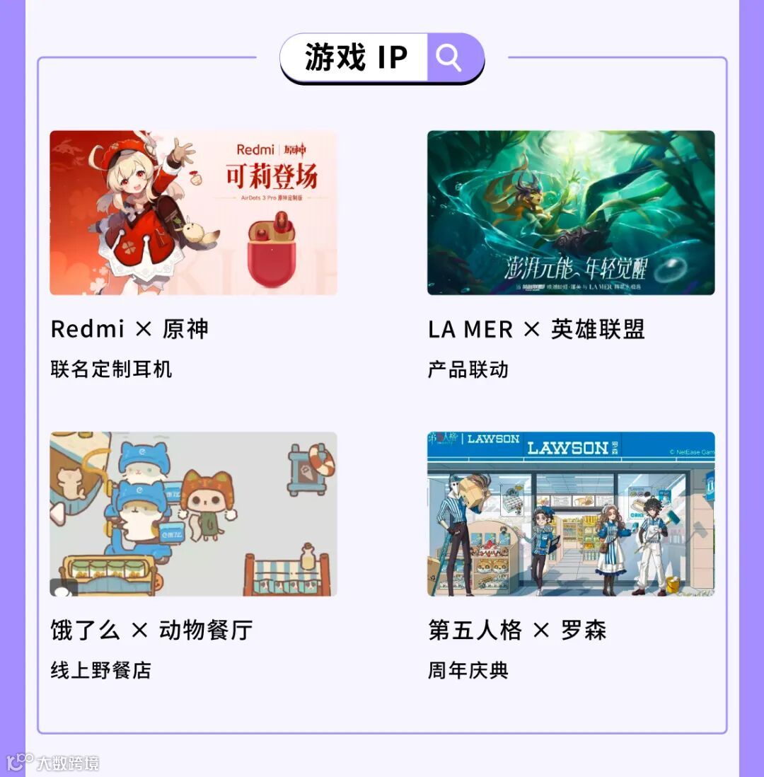 受到 LPL 春季赛等一系列电竞赛事的影响,产品方面,品牌着重打透产品点,从性能出发,为专业玩家提供装备支持。《和平精英》、《第五人格》等游戏都在 4 月举行了形式各异的周年庆。虚拟游戏与现实的跨次元联动,依然是品牌联合的主要形式。例如,LAMER 海蓝之谜精粹水联动《英雄联盟》手游中的经典英雄「唤潮鲛姬·娜美」,在游戏中共同演绎「海洋元能」;王者荣耀与昆明金殿名胜区共同打造「十二花神游园会」,再现游戏场景,把玩家的沉浸式体验延伸到线下。