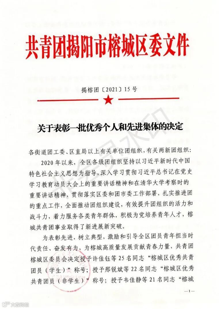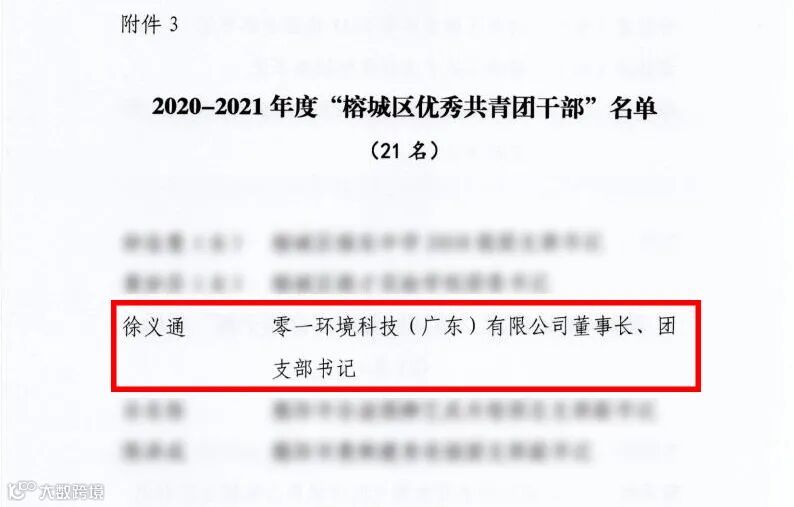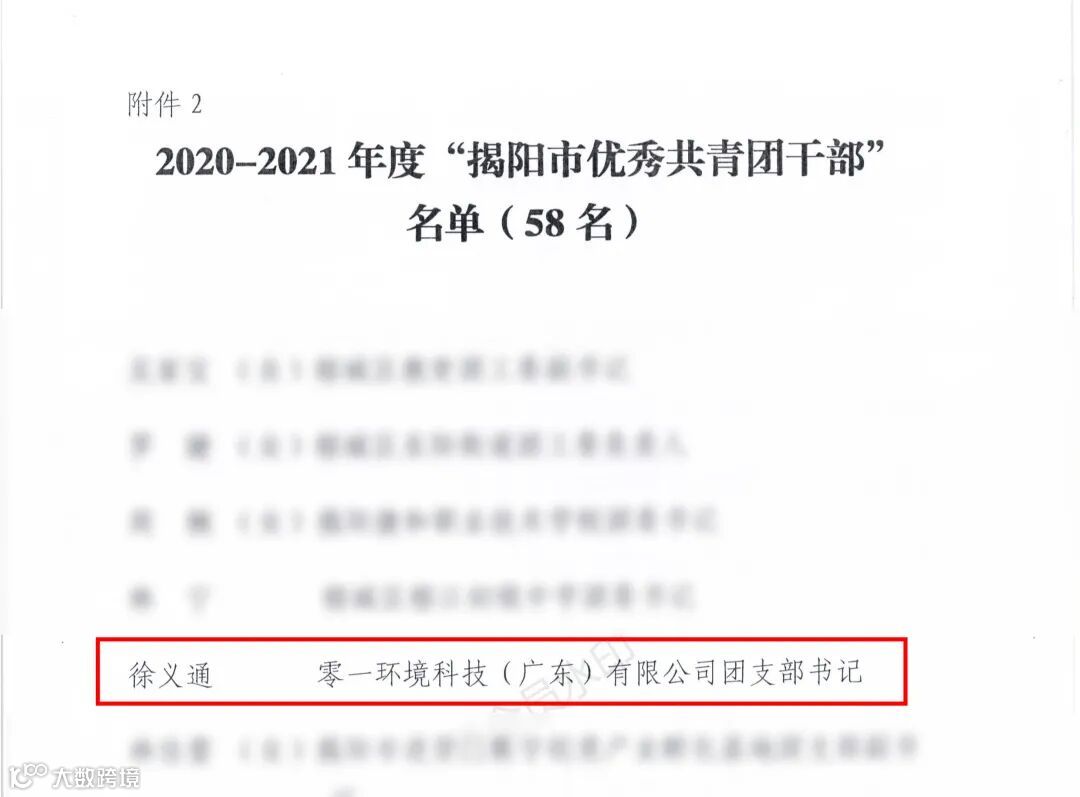 零一环境董事长徐义通获得“揭阳市优秀共青团干部”与“榕城区优秀团干部”荣誉称号。
