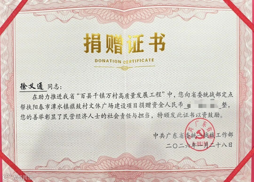 为响应省委统战部号召,“零一守护者公益”帮扶阳春市潭水镇旗鼓村文体广场建设项目捐资,为定点帮扶的阳春市潭水镇旗鼓村文体广场建设倾情助力。这份善举,既彰显了民营企业家与国家战略同频共振的责任担当,也为社会力量参与乡村振兴树立了典范。