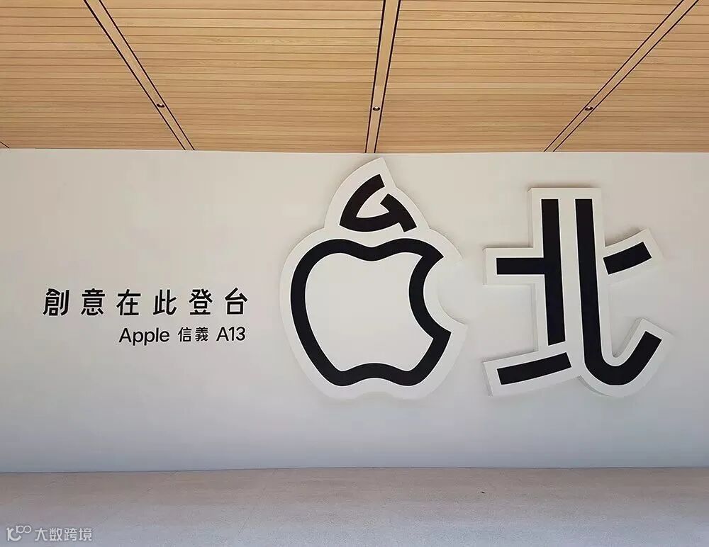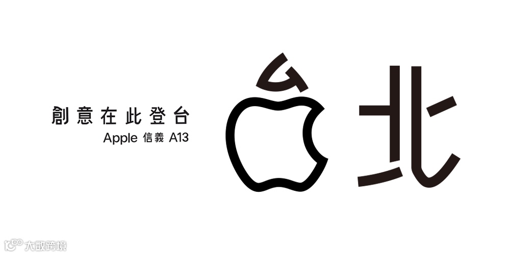 为了迎合台湾地区的市场,苹果入乡随俗,将自己的苹果LOGO非常巧妙的和汉字“台”字进行融合(台的口字部分变为苹果LOGO),然后组成“台北”二字,左侧还放了一个标语:“创意在此登台,Apple信义A13”。