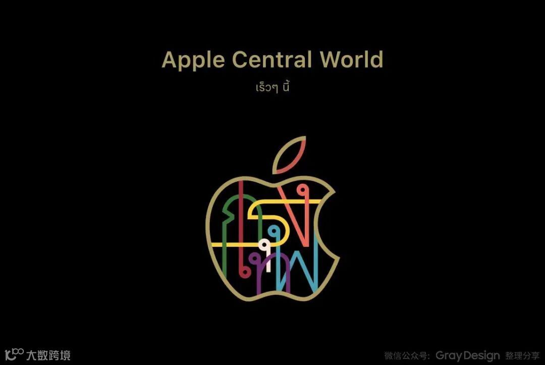 该LOGO采用经典的黑金配色,将苹果 标志以金色描边呈现,同时为了融 合当地文化,特别在LOGO中加入泰文苹果แอปเปิ้ล(Apple)的「อ」,作为设计元素。