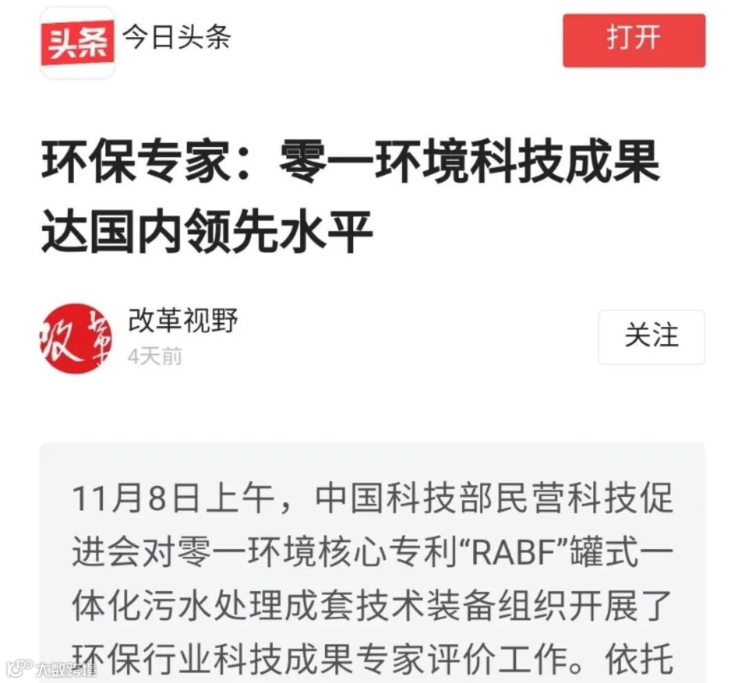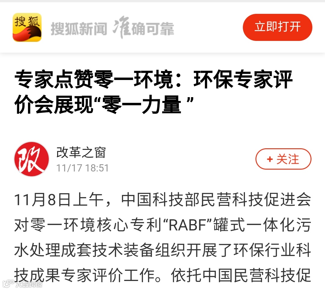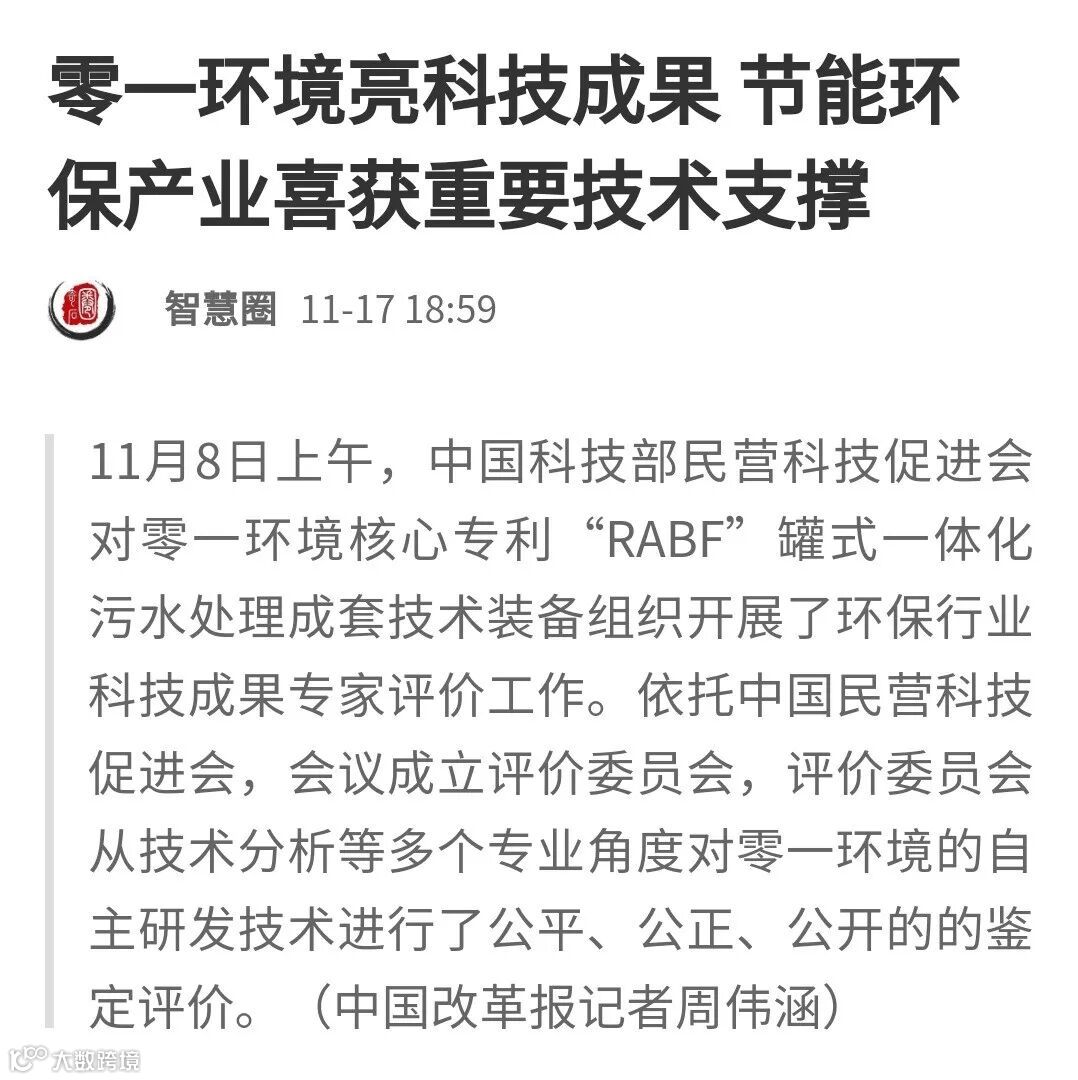 11月8日上午,中国科技部民营科技促进会对零一环境核心专利“RABF罐式一体化污水处理成套技术”装备组织开展了环保行业科技成果专家评价工作。