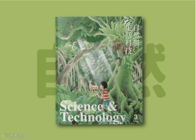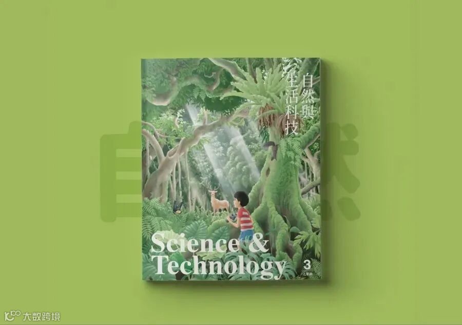 封面设计围绕“自然”主题以绿色为主色调,通过插画呈现。画面中的小孩在茂密树林中探险就好比学生在探索自然知识有着很强的代入感。