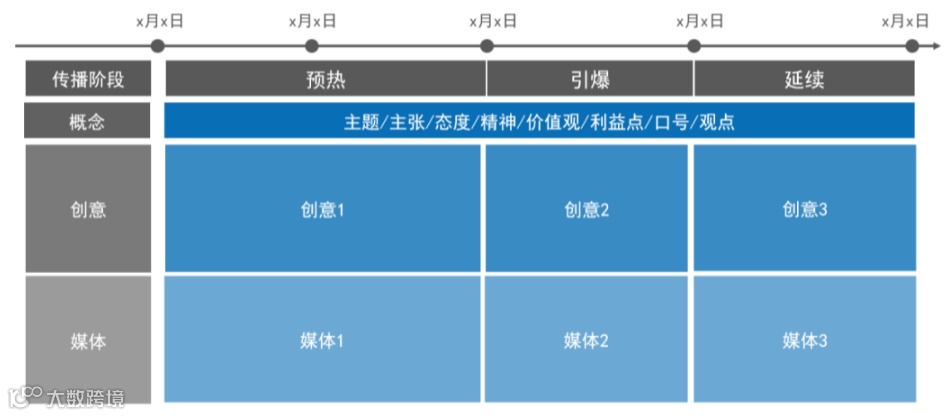 传播排期的主要形式为传播信息屋,主要包括:传播目标、传播节奏(预热、引爆、续热)、传播策略、传播概念(主题)、传播创意和传播媒体。