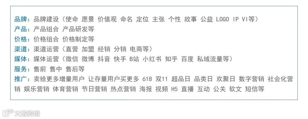 如卖给更多增量用户、让存量用户买更多、618、双11、超品日、品类日、欢聚日、数字营销、社会化营销、娱乐营销、体育营销、节日营销、热点营销、海报、视频、H5、直播、互动、广告、公关…