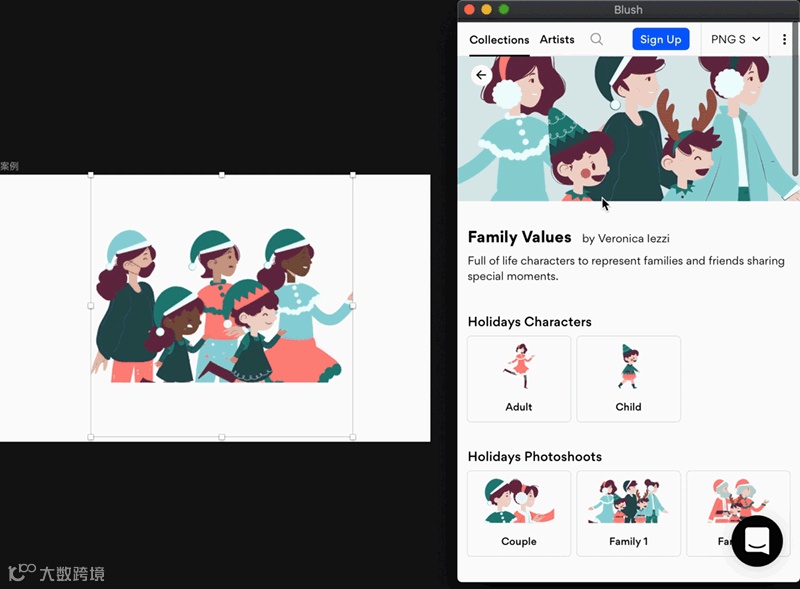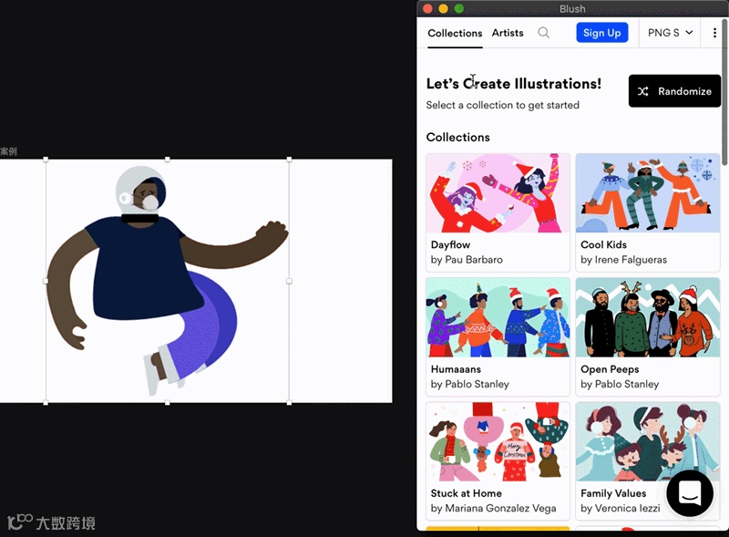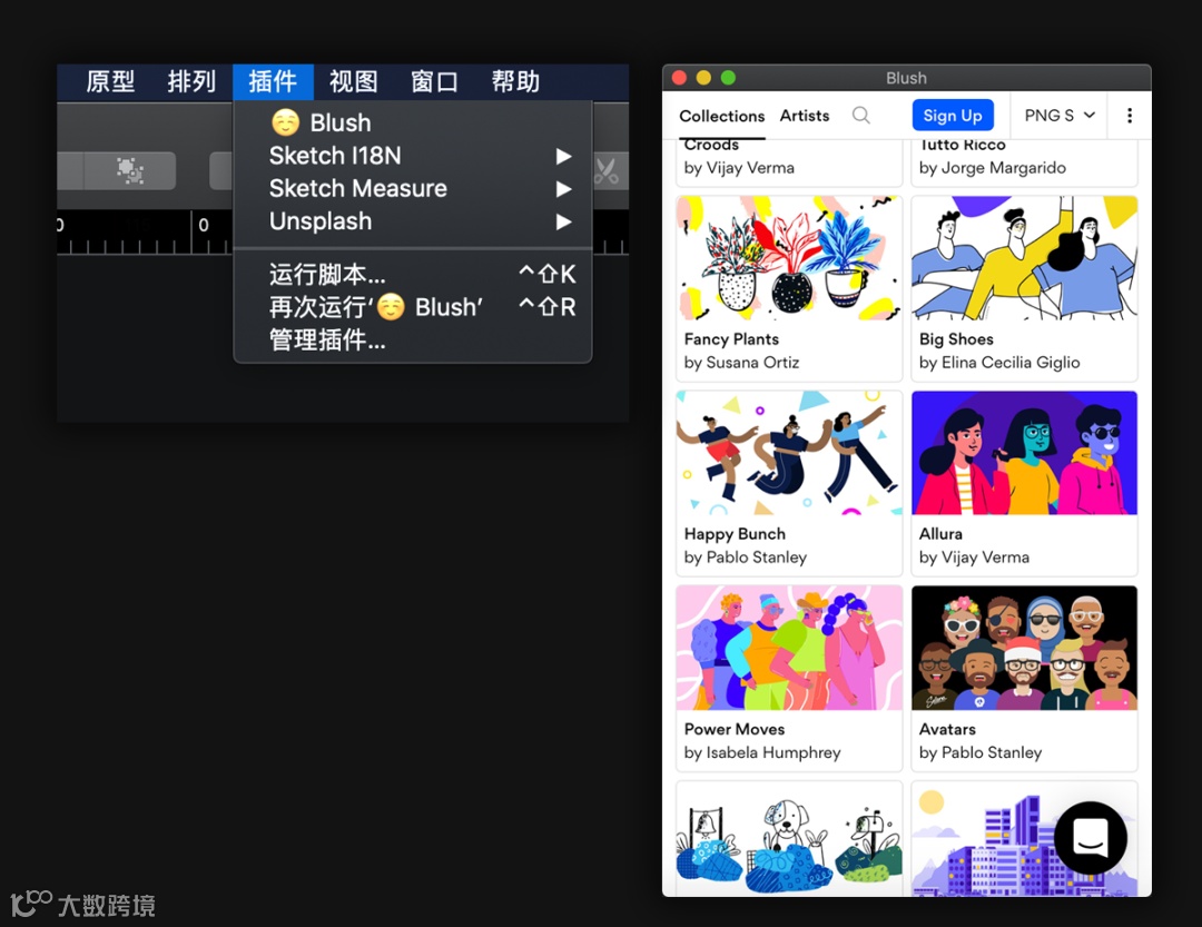 下载插件(后台回复:插件,即可获得安装包)并安装。从sketch的插件菜单点开Blush插件,点开后会出现一个插画库弹窗。