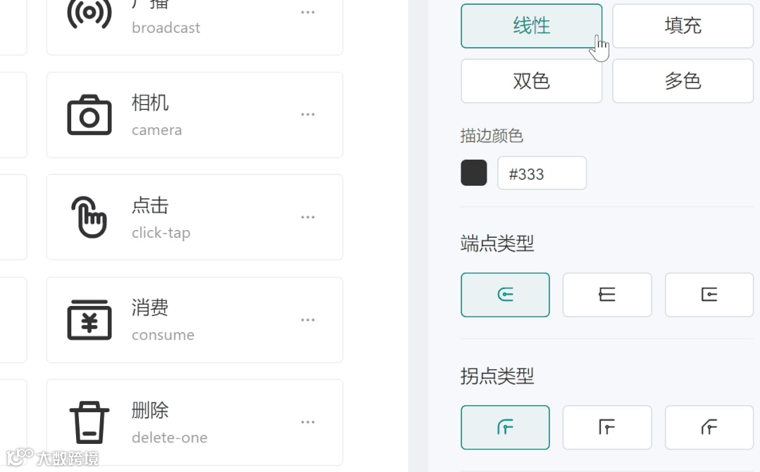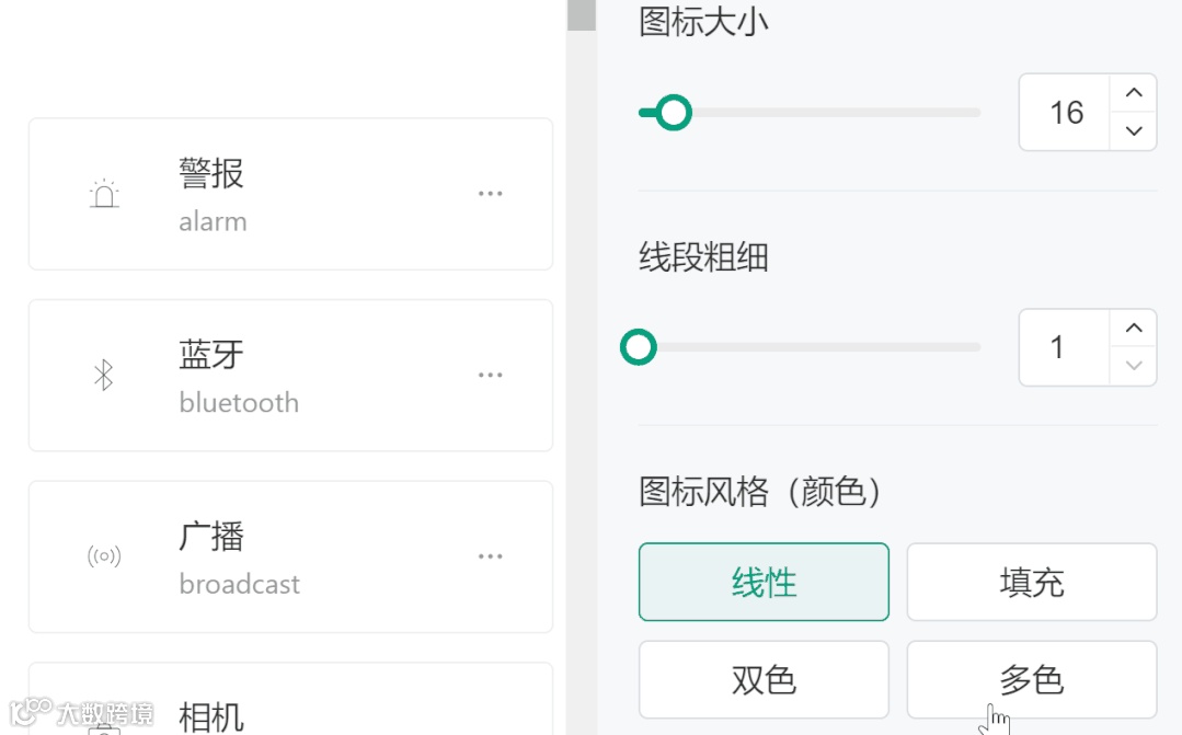 在线调整图标大小和粗细,还可以直接切换面性和线性图标,支持在线更改颜色和端点类型。无敌方便~