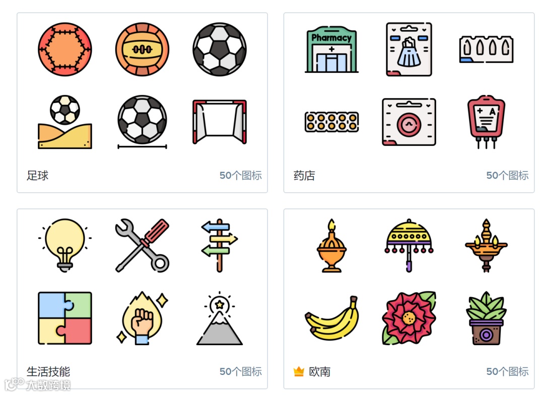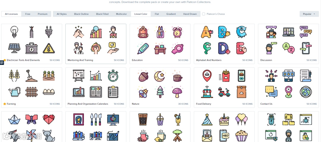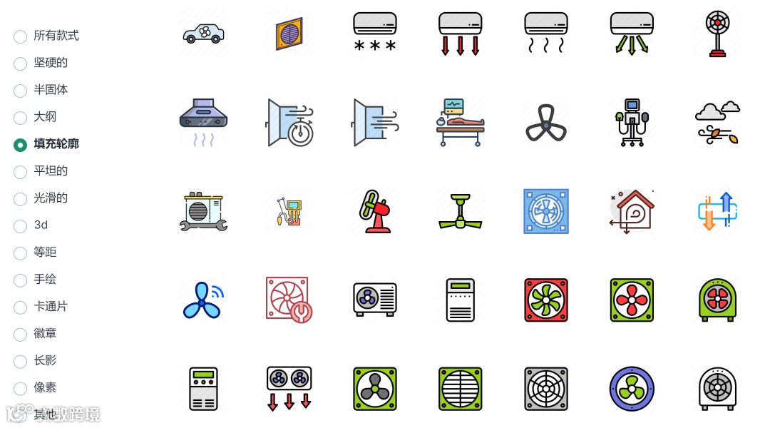 左侧分类也非常多,填充、非填充、3D、平面彩色、手绘各种类型都有。整体系列感很强,在所搜的过程中,视觉很舒服~
