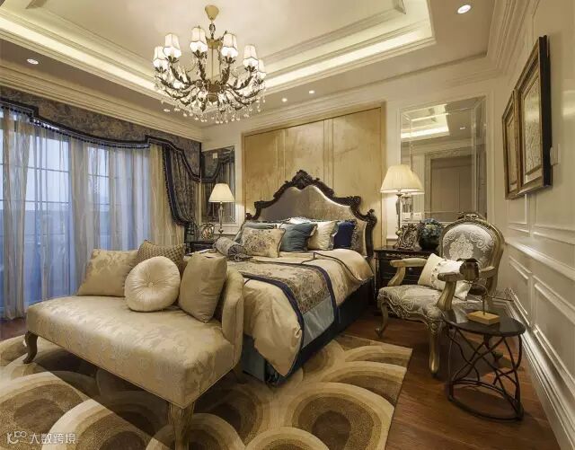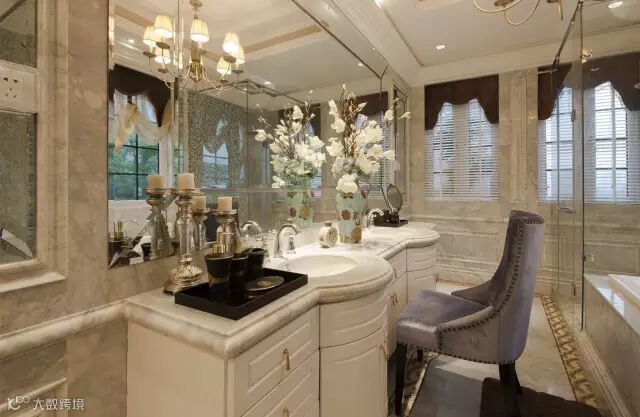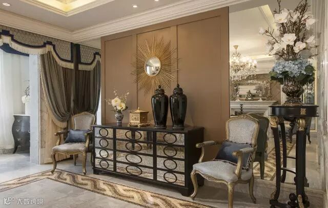 变化丰富的卷草纹样、蚌壳般的曲线、舒卷缠绕着的蔷薇和弯曲的枝蔓,餐椅配合扶手和椅腿的弧形曲度,显得优雅矜贵,精美的桌椅在古典吊灯、瓶插鲜花的搭配下,浪漫典雅之感扑面而来。空间突出轴线的对称,恢宏的气势,高贵典雅。精细雕花,庄重大方、典雅气派,璀璨的吊灯,充分彰显主人之高贵身份与地位。