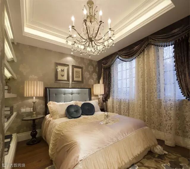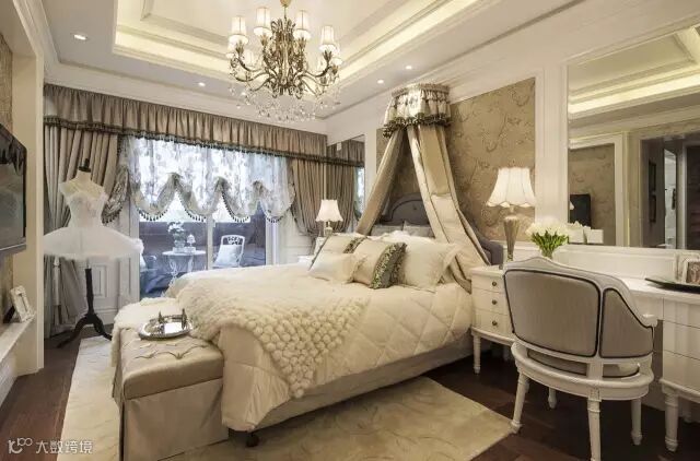 卧室以白色为主基调,搭配深木色地板,整体色调平静而不苍白,浅色所营造的宁静氛围有助于让烦闷的心情得到平复。仿若置身于古堡宫殿之中,回到十五六世纪的古典时光。