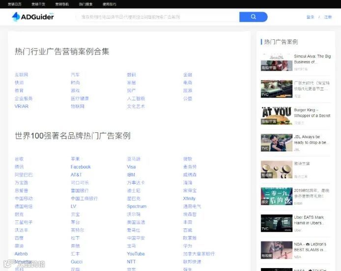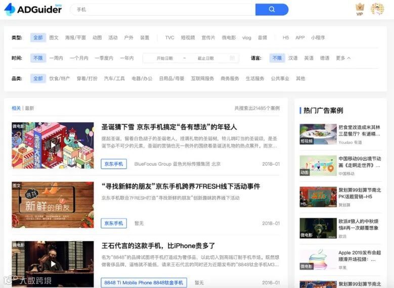 ADGuider 广告指南致力于为市场营销人,提供精准、全面的广告案例搜索工具,精选全球广告案例,提升广告业服务品质和效率。也是个人比较推荐的一个网站。作品非常全面,可以溯源一个企业或品牌的广告内容。目前共汇聚 68 万全球案例,更多案例每天都会更新哟。