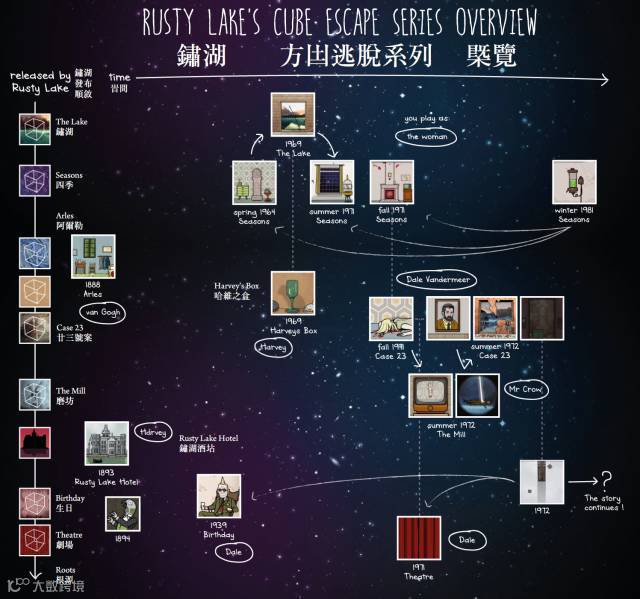 在《逃离方块 Cube Escape》这个系列的故事里,“Rusty Lake(锈湖)”是个神秘的词语。除了开发者们的独立游戏工作室的名字,也是由他们创造的令人毛骨悚然的、超现实主义的世界,系列游戏中的每部作品都是相互有联系的,故事都与这个“Rusty Lake 锈湖”有关。