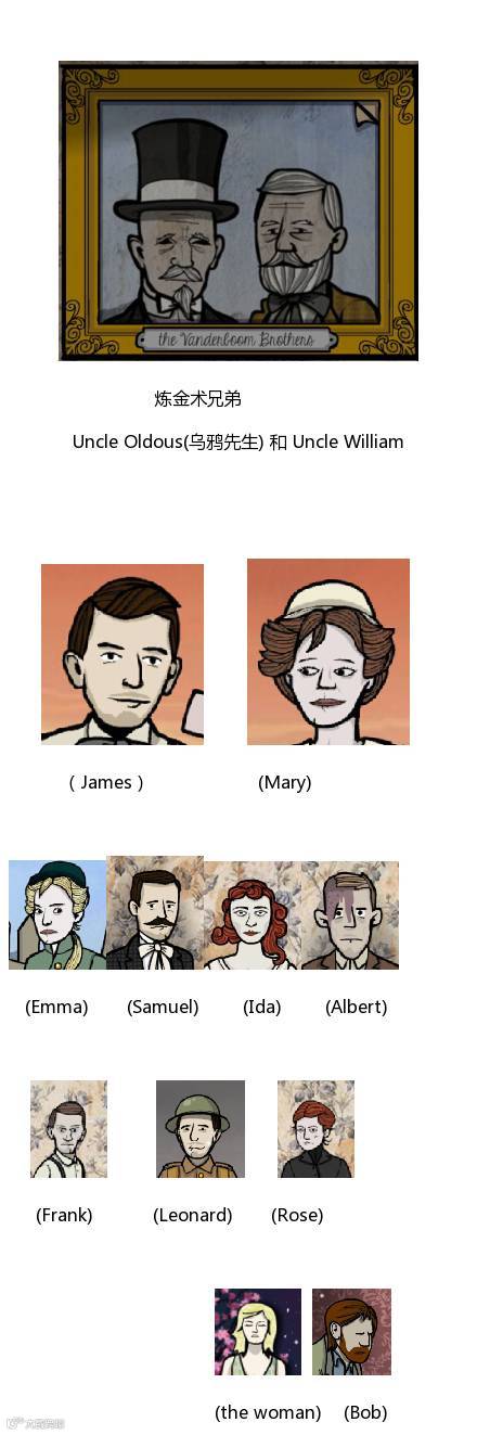 十二:1919年,Rose遗传占卜师妈妈、巫毒术爸爸的基因,有一部分通灵的能力。她察觉到炼金哥哥William Vanderboom灵魂的存在,于是试图与他交流。#这里玩家开柜子能看到镜子,能看出镜子里的人和Leonard受伤脑中人相似,所以镜中小黑人=炼金哥哥=玩家#