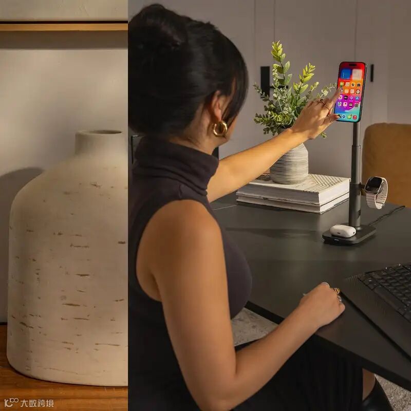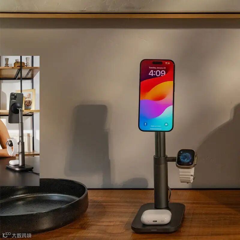 支架角度高度可自由调节:无论哪一种姿势,支架都能够满足(20cm-40cm 伸缩范围),让你保持最舒服的姿势在充电的同时也能使用手机。适配 iOS 17 StandBy 模式,横屏秒变智能桌面时钟,让你在办公或休息时,也能像 F1 车队的监控屏一样,实时掌握设备状态。