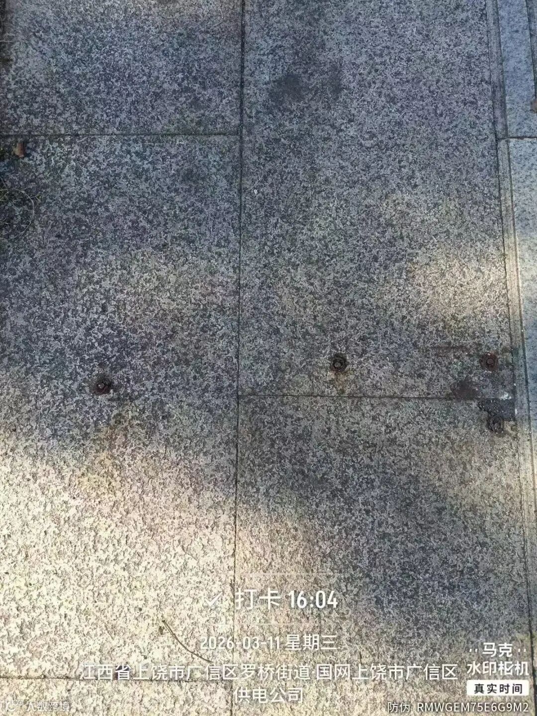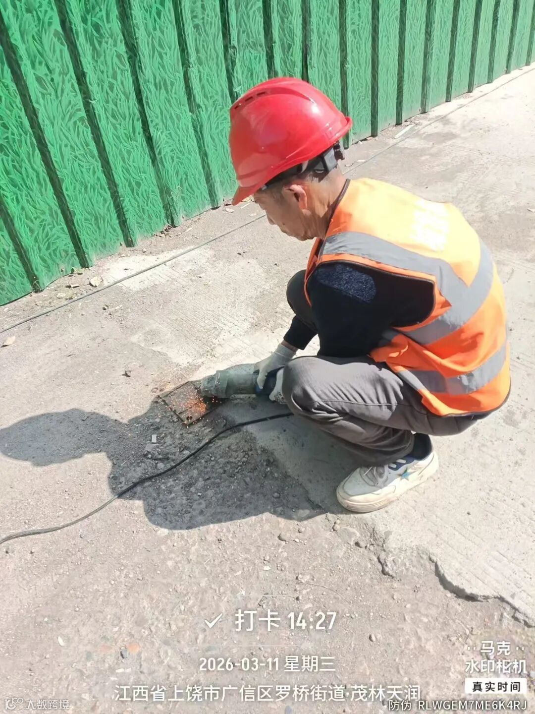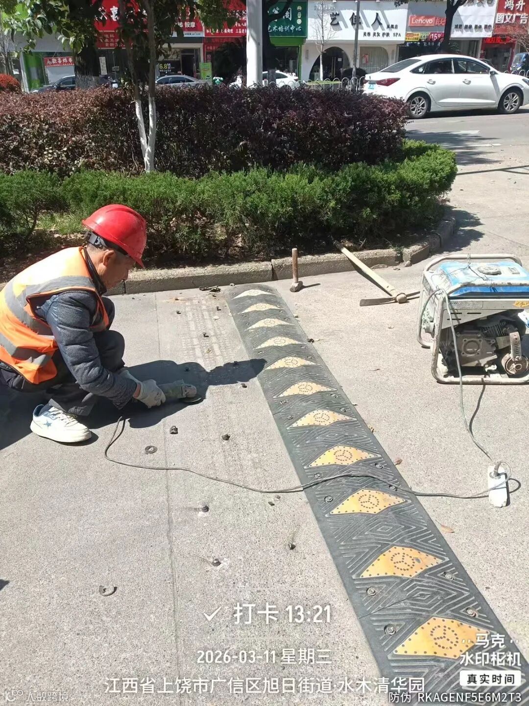 对三清山西大道33号(德宝车行)、旭日北大道(罗桥街道部队和中医院人行道)、七六路(水木清华园二期路口)等路面减速带拆除后遗留的废旧螺杆切割。