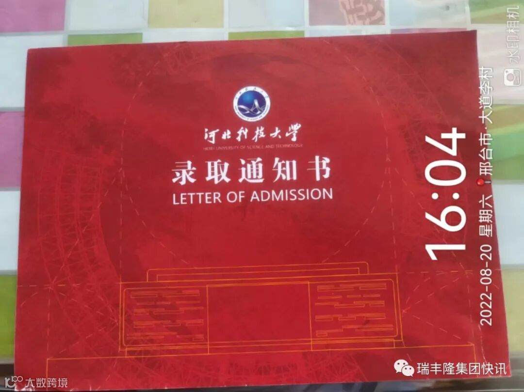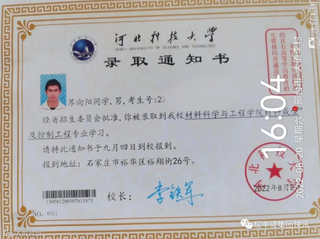 祝贺河北省南宫市大村乡大道李村金太龙人苏红志的孩子苏向阳被河北科技大学录取!
